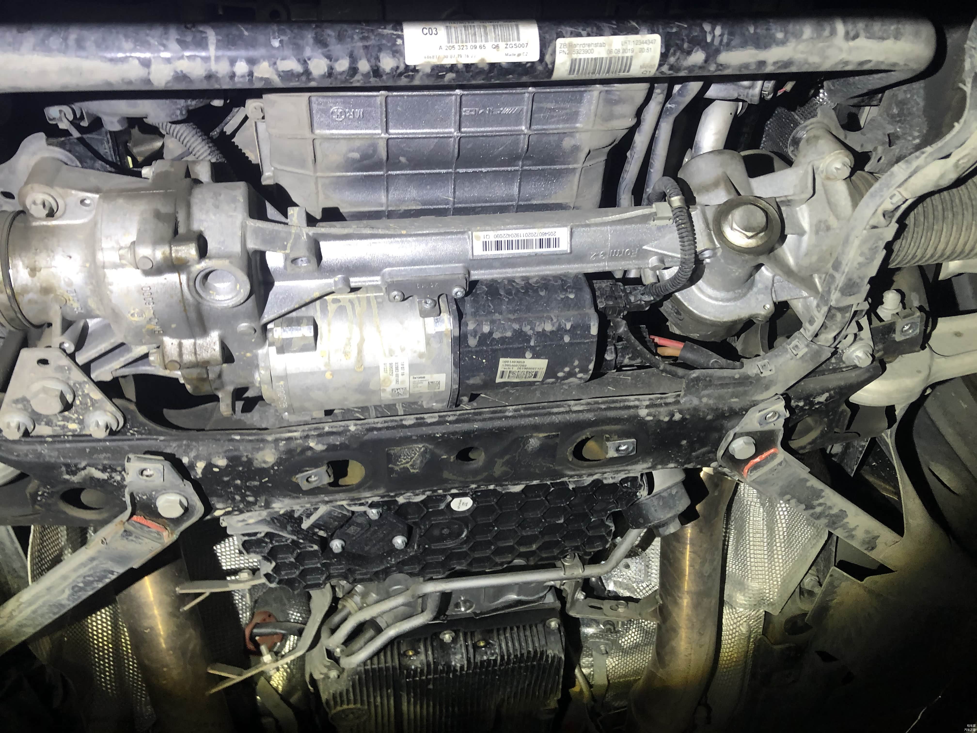 现在我们来看底盘,把护板拆掉之后可以很清楚的看到底盘状态,发动机变速箱转向机都很干净不曾有漏油情况。