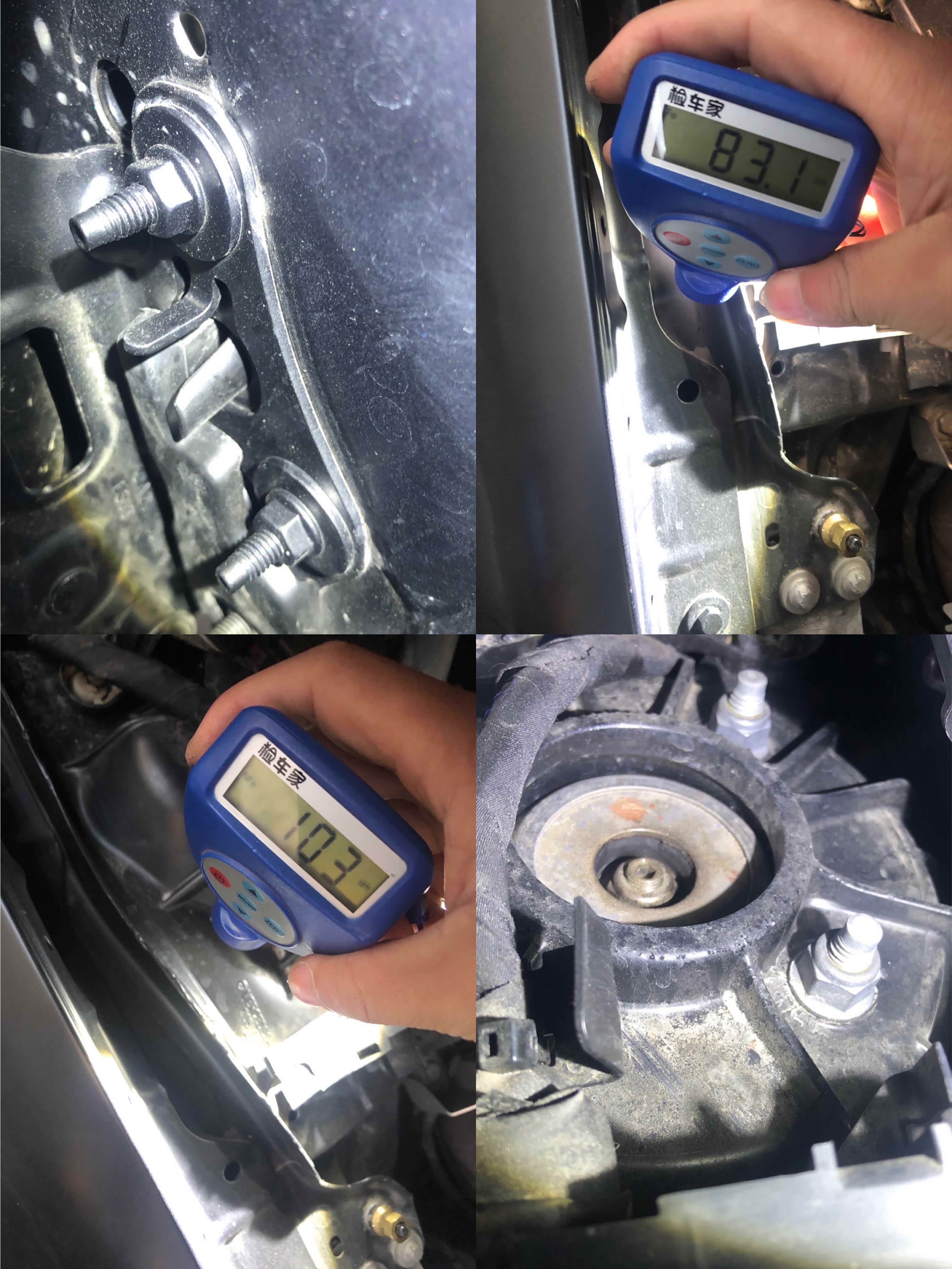 左前翼子板梁与避震包表面漆面数值未发现异常,周围的胶体也符合原厂状态,避震固定螺丝也未曾拆卸,排除左侧侧面撞击的可能性。