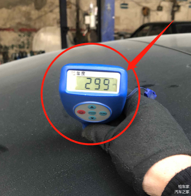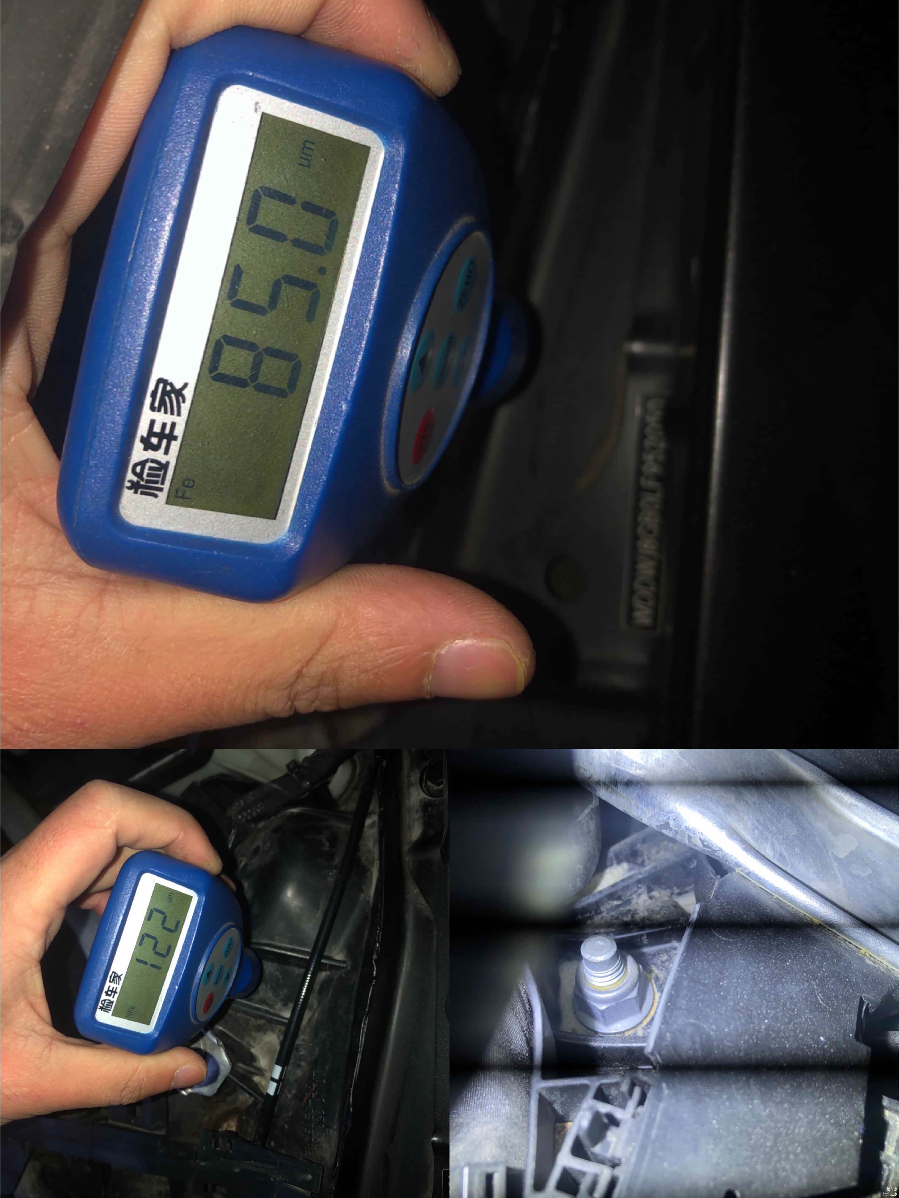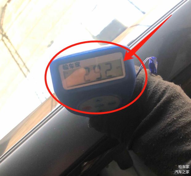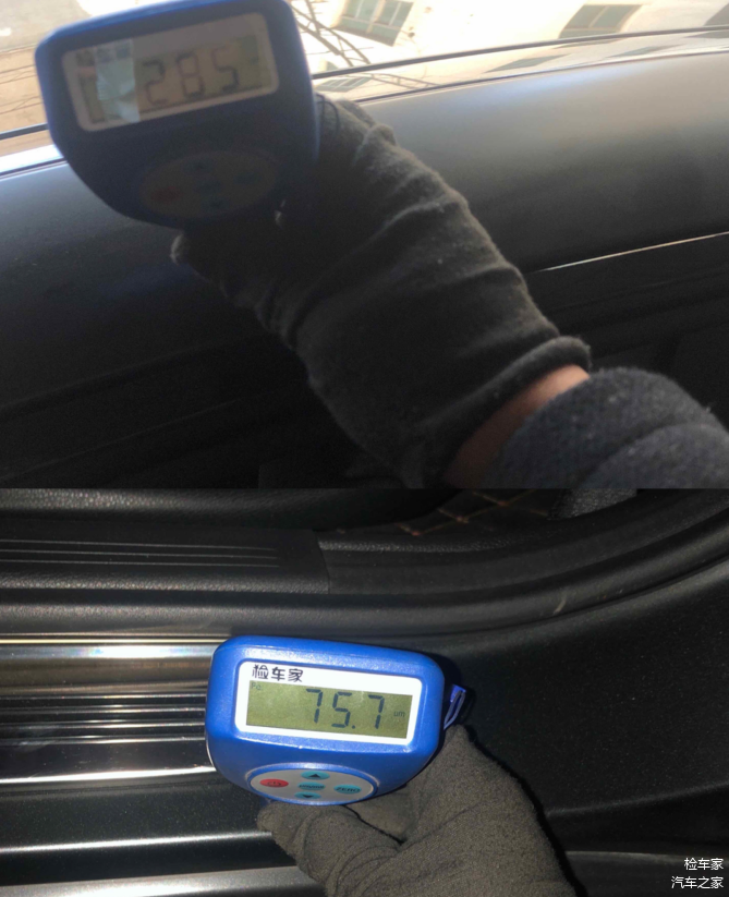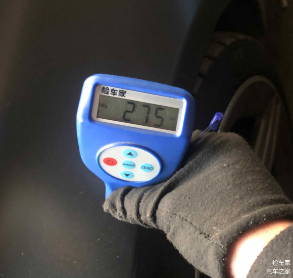 因为全车是贴了磨砂黑车衣,所以我们选一个最不容易喷漆的车顶选一个漆面厚度的参考值。