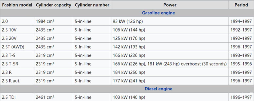 T-5标识则代表它是带有涡轮增压的五缸发动机。这种动力命名方式延续至今,比如T4、T5、T6、T8,只是已经与气缸数毫无关系了。好比今天的奔驰C260、宝马的330i也与排量关系不大,代表的只是动力级别。