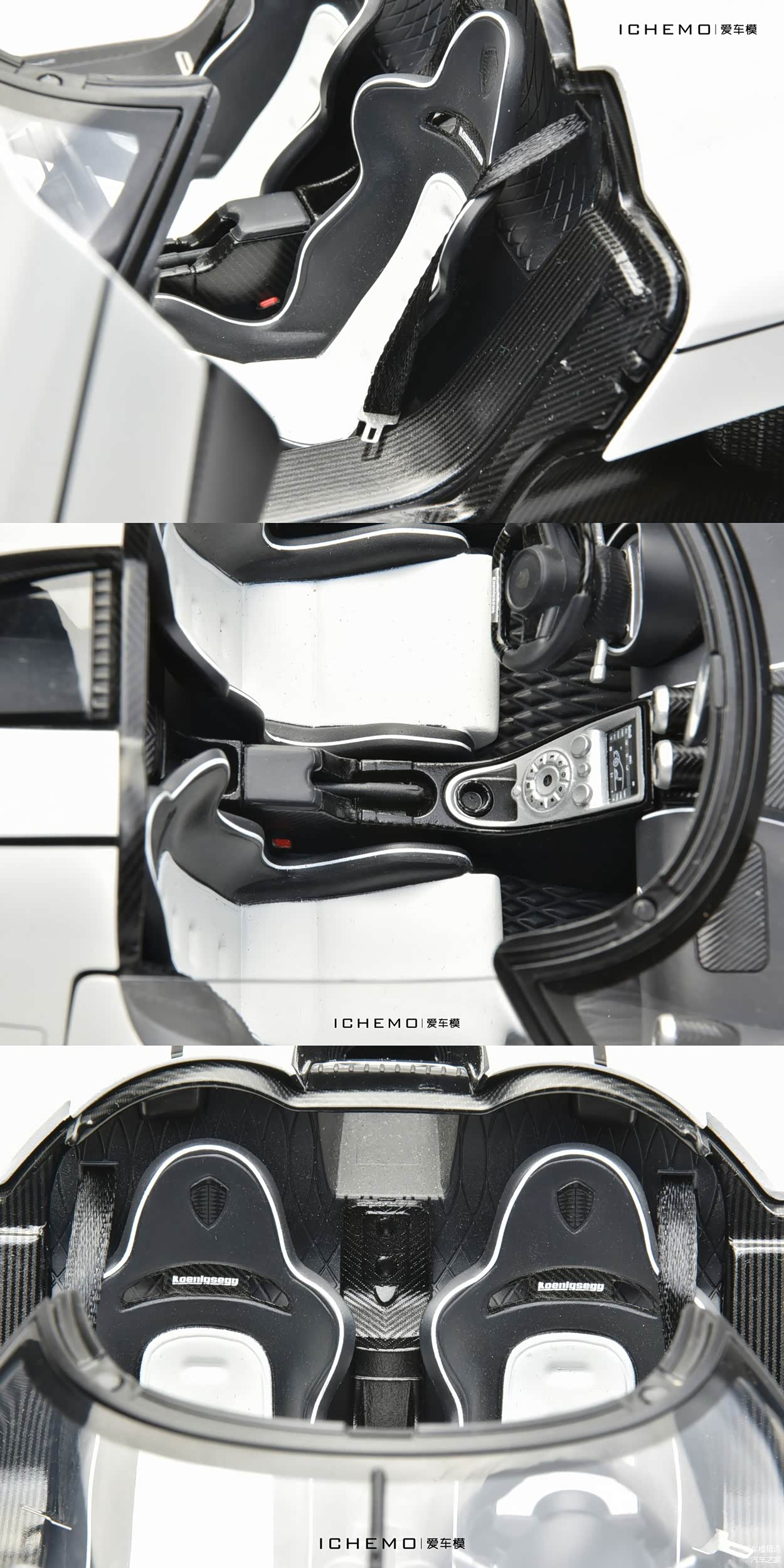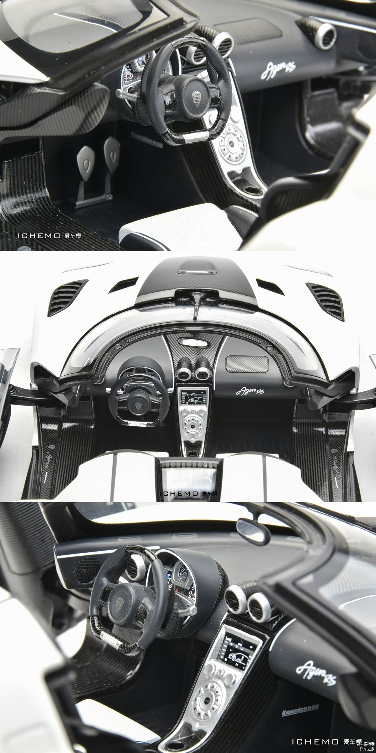 Agera RS 不仅是赛道利器,还是台合法的公路超跑,车内舒适/娱乐设施一样不少 - MP3/USB 连接、卫星导航、空调、带记忆泡沫的桶形碳纤维座椅 ... 模型方面则参考实车刻画细节。嗯,是 AUTOart 风格的内饰细节。