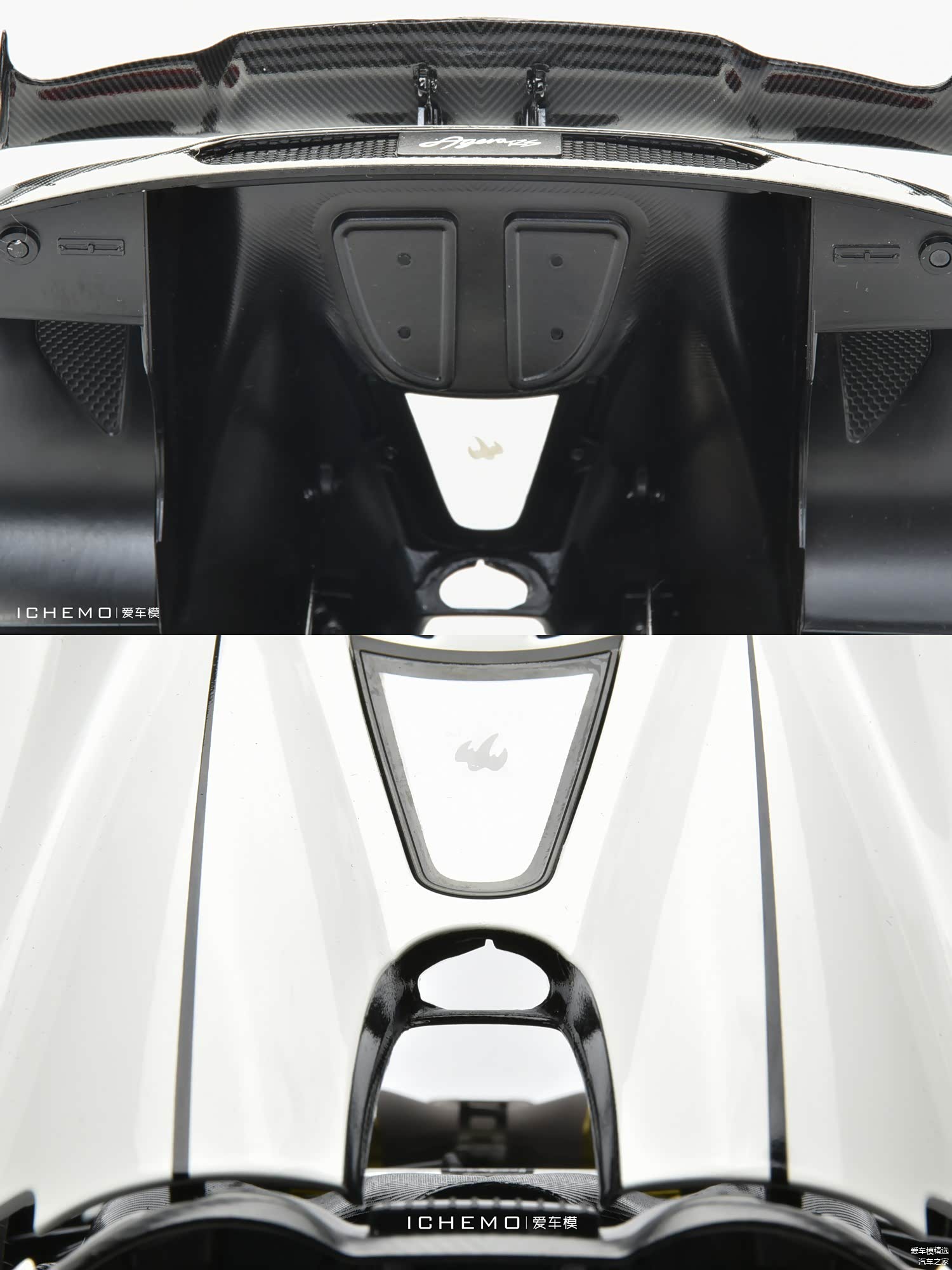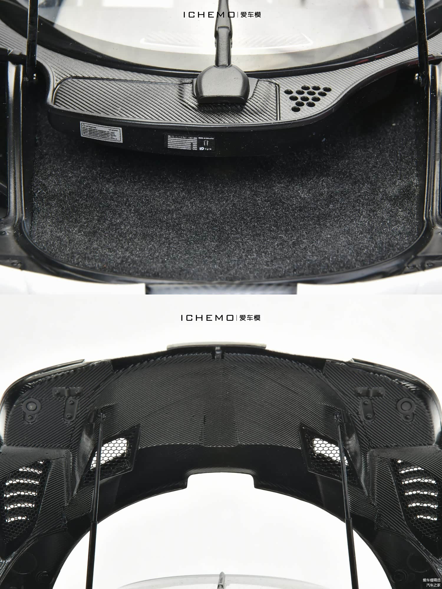 前盖负面为刻纹式 “碳纤维”,这在此前的 AUTOart 超跑模型作品上也有运用;下图为前备厢内部其他结构细节展示: