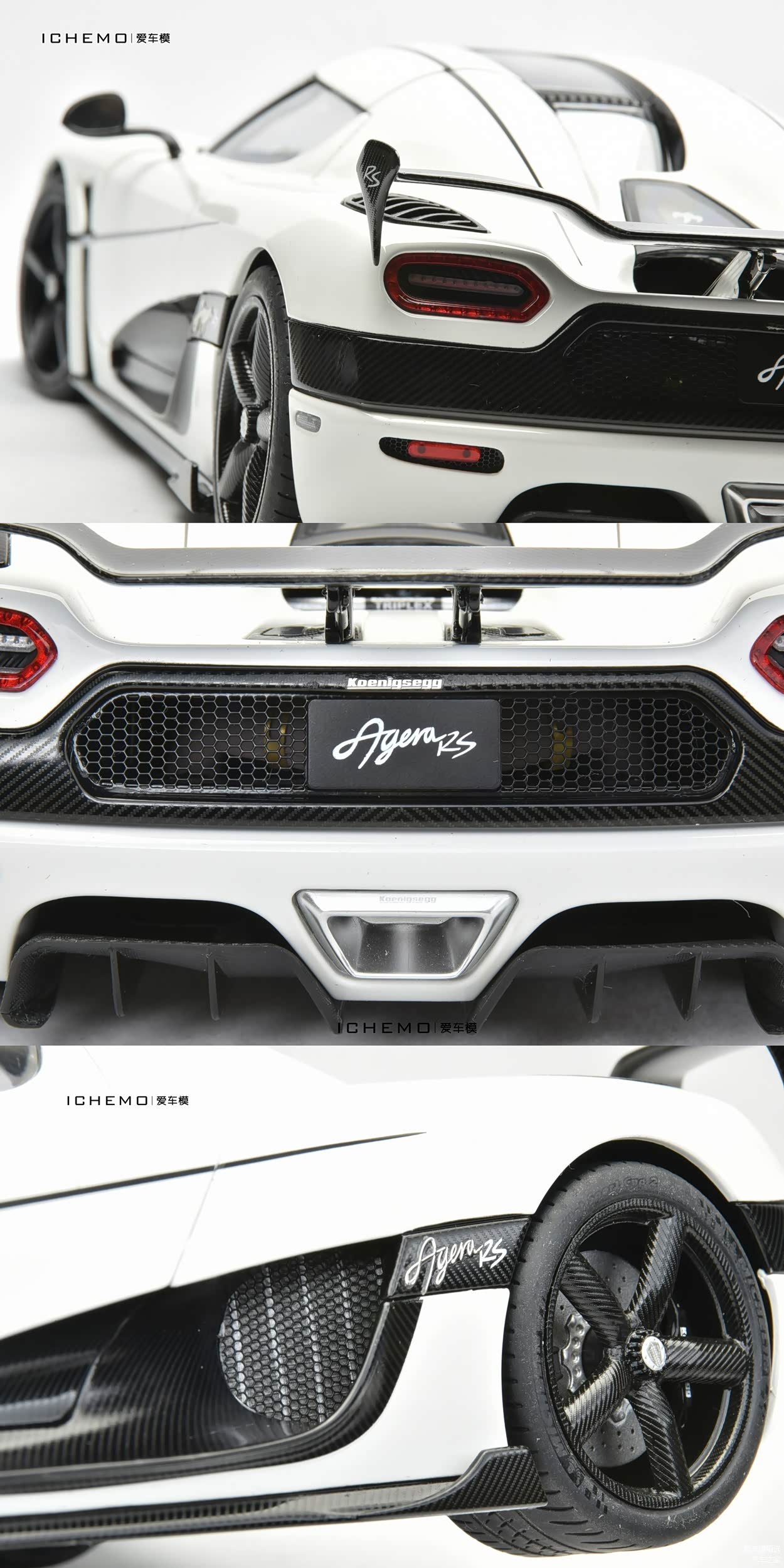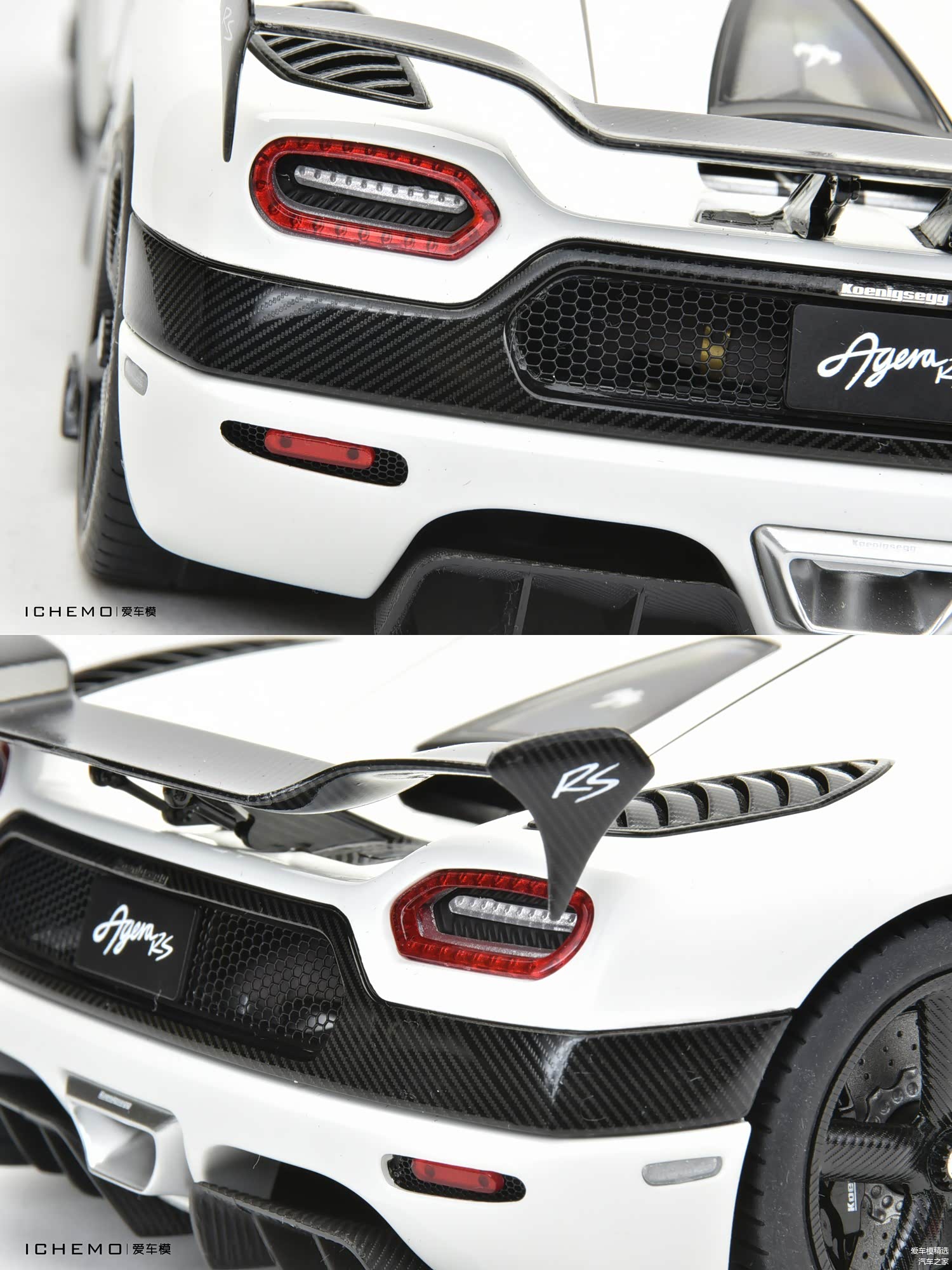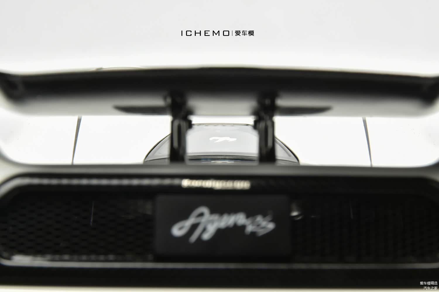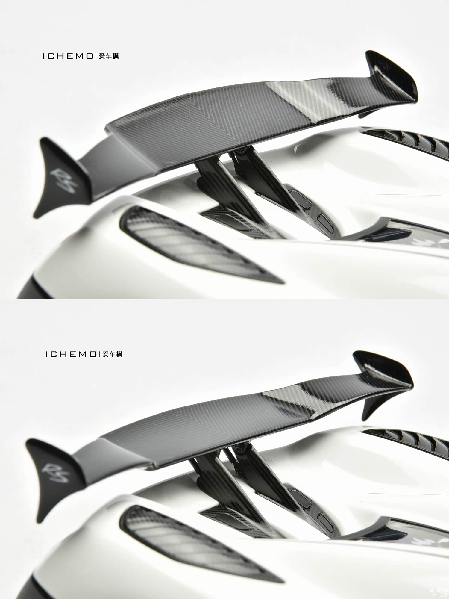 模型尾翼角度可上/下微调,有小 “液压杆” 补强细节;尾翼表面 “碳纤维” 纹路对称,翼端可见 “RS” 标识;车身侧面 “Agera” 车标为覆膜金属贴,“RS” 则为印刷。