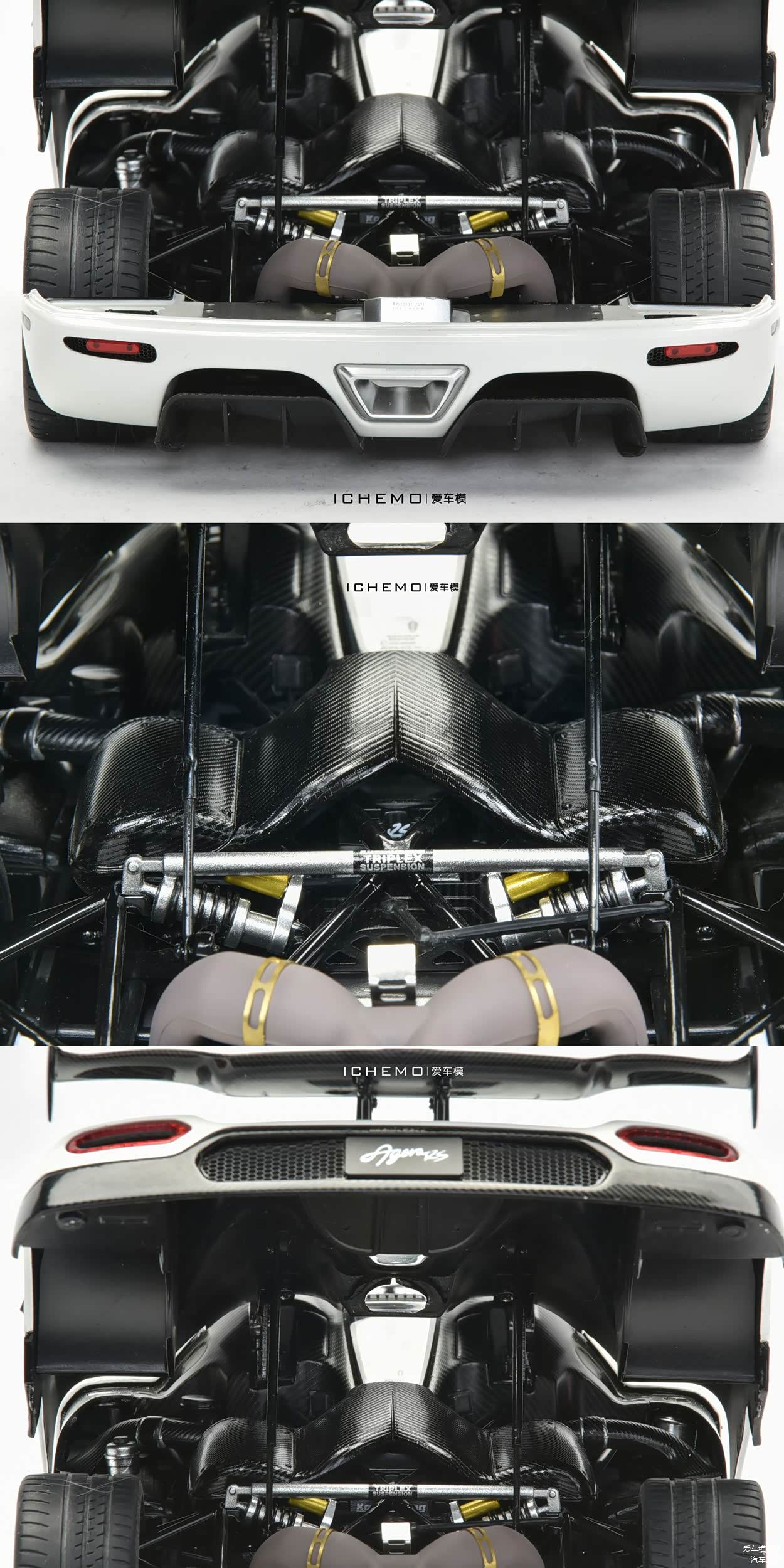 Koenigsegg 超跑尾部具有极高的识别度,一看就是惹不起的家伙。模型车尾镂空位、“碳纤维” 布局参考实车还原,透过网格可见部分内构细节。