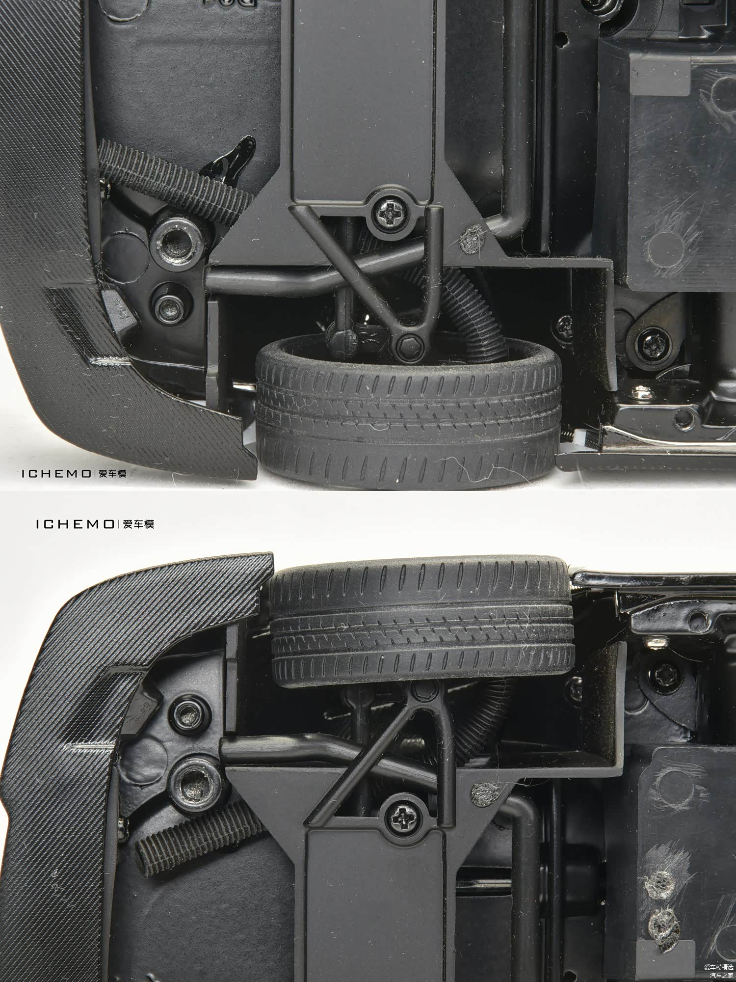 虽然没有可动悬挂功能,但 AUTOart 还是刻画了叉臂结构;值得一提的是,刹车冷却管确为中空软胶材质。