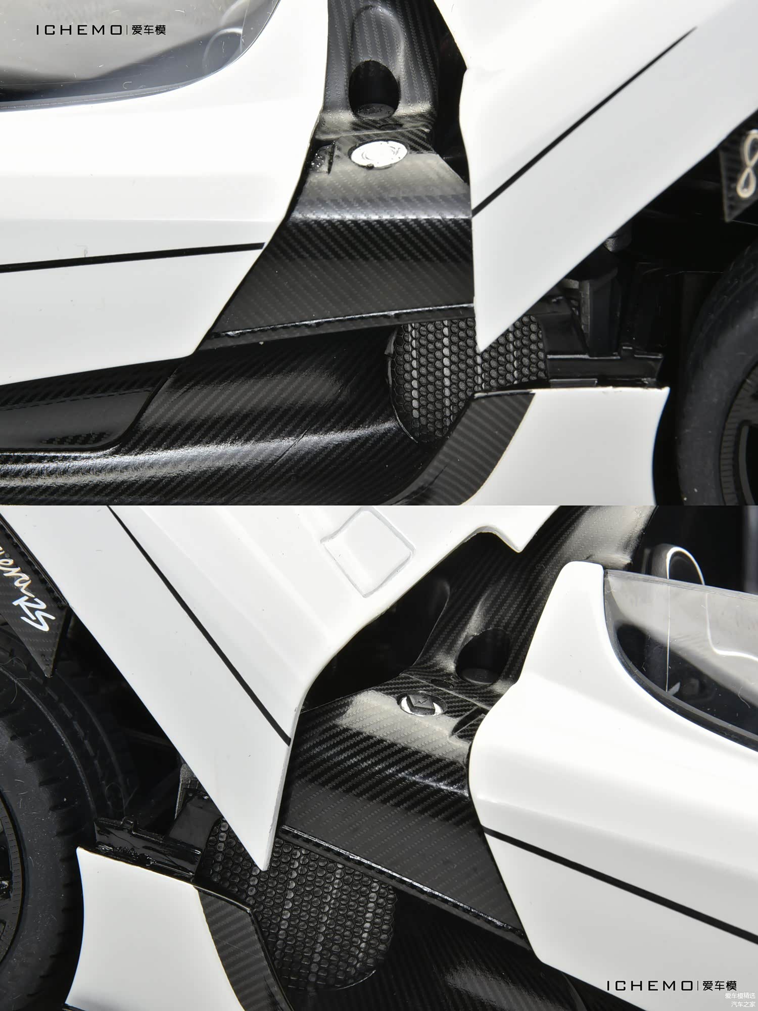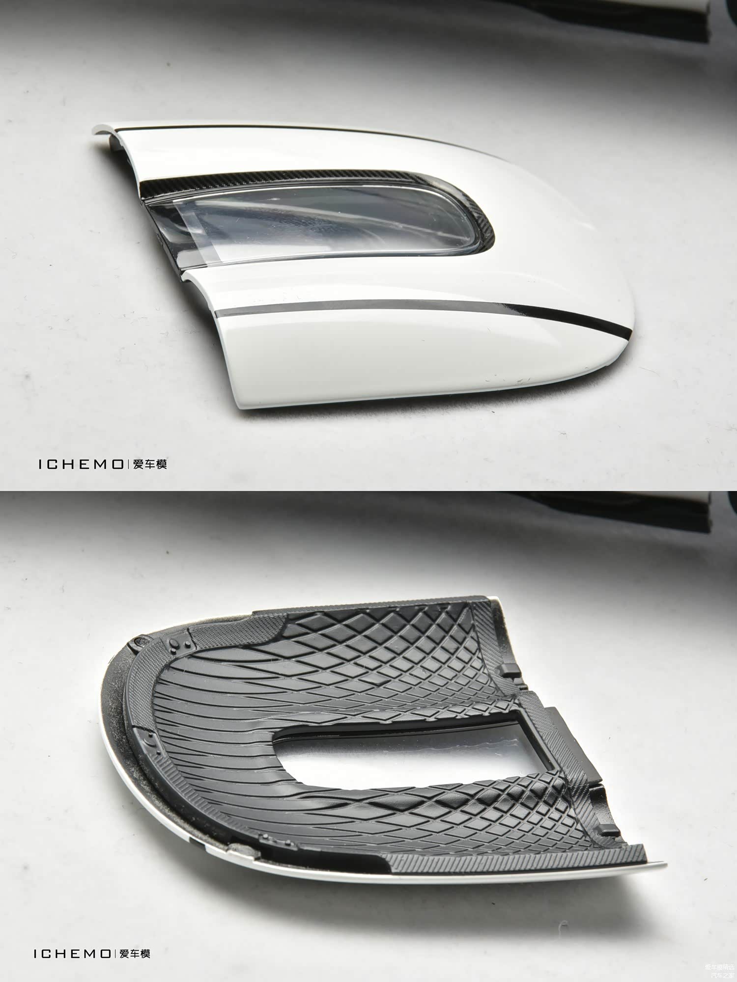 模型前大灯组内壁有 “碳纤维” 式样表达,灯珠有刻画,行车灯为漆涂工艺;大灯罩透明件边框描黑,可有效地掩盖着胶点;车身各处风刀按实车排布,以水贴纸或刻纹工艺表达 “碳纤维” 质感;通风孔处有镂空蚀刻片补强细节;车头标细节为印刷。