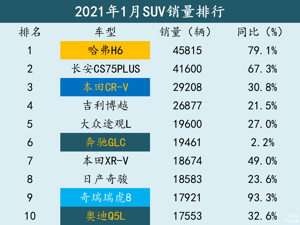 1月正值农历新年前夕,新车成交量上升,SUV零售销量达到了98.9万辆,同比增长23.5%,冠军依然是哈弗H6。