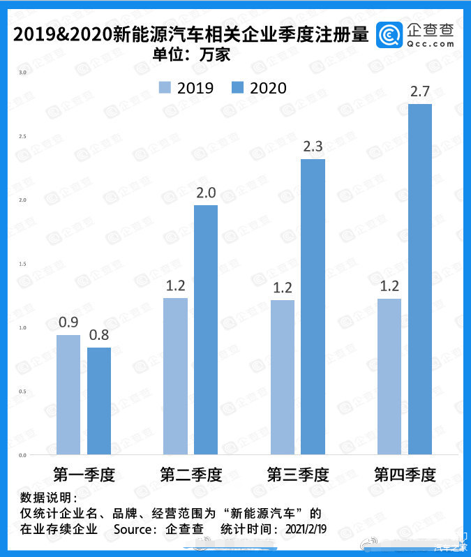在此基础上,新能源汽车产业链相关企业数量随之高涨。企查查数据显示,目前我国共有新能源汽车相关企业23.2万家,2020年全年新注册企业7.86万家,同比增长70.8%,其中四季度新增企业2.7万家。