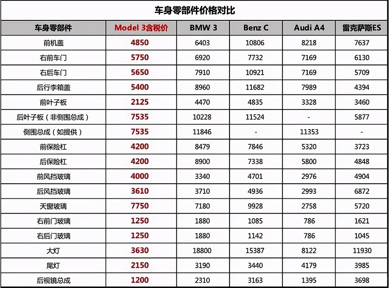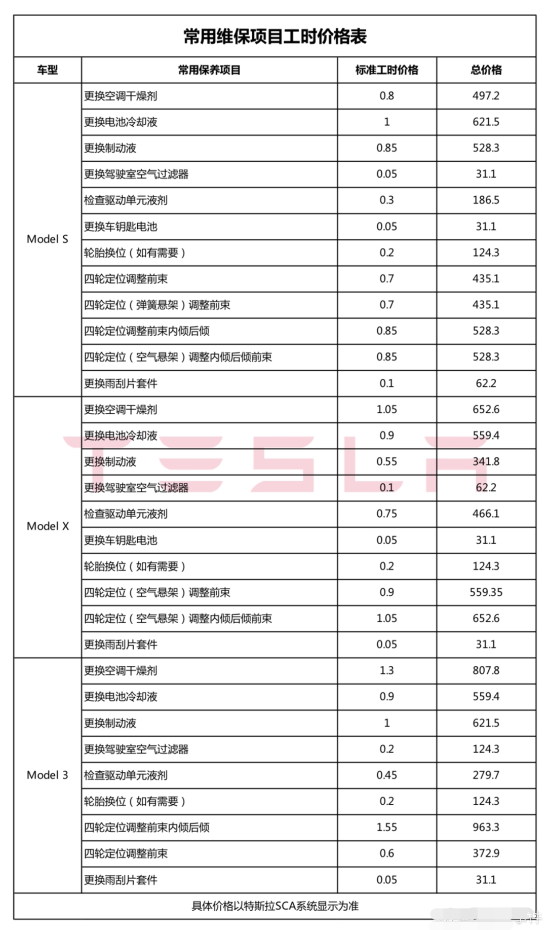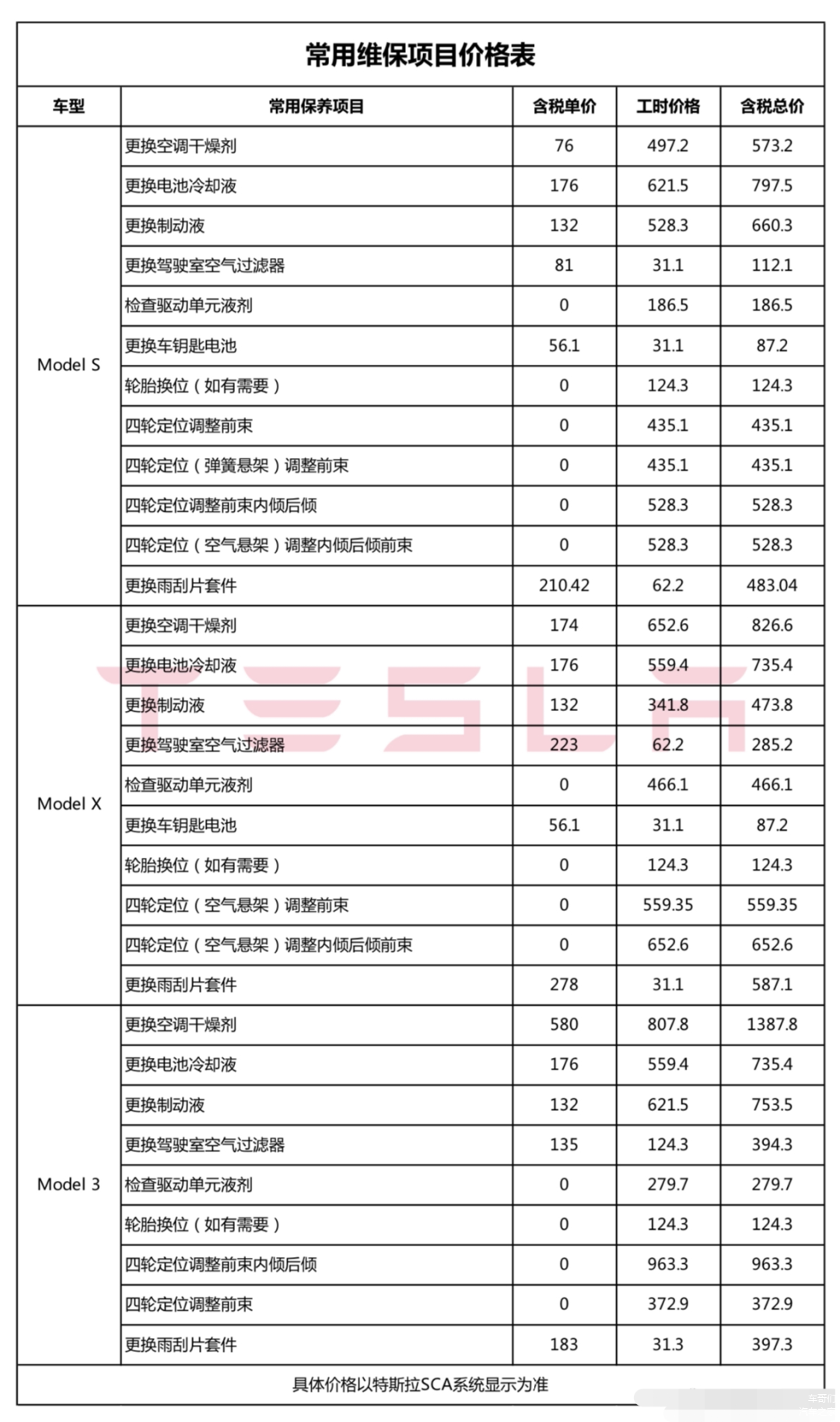 近日,特斯拉把不同车型的常用维保项目价格表,全部公示在门店墙上。表格内容丰富,包括跟宝马,奔驰,奥迪同款车型的零配件价格对比,保险价格对比等等。