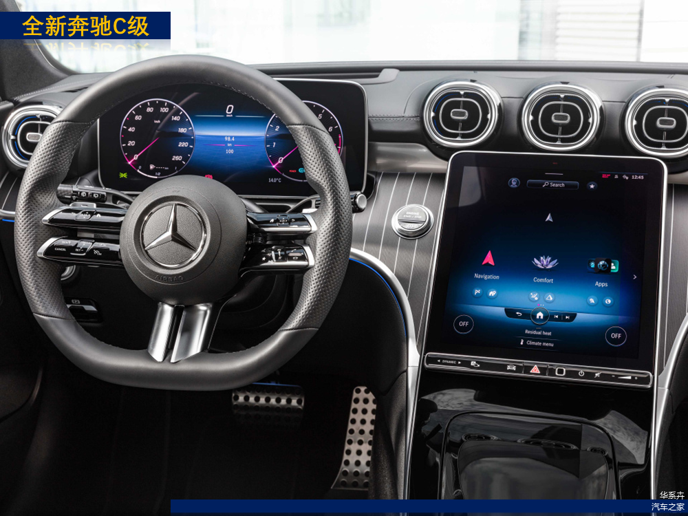 当然科技水平还算与大哥S级有差异的,新车采用了12.3英寸全液晶仪表,但不支持裸眼3D,也没有AR HUD。中控屏幕为11.9英寸,有6°的倾斜角,毕竟S级的12.8英寸中控屏幕要兼顾后排老板的,C级一般是车主自己用的,人机工学体验要更好。