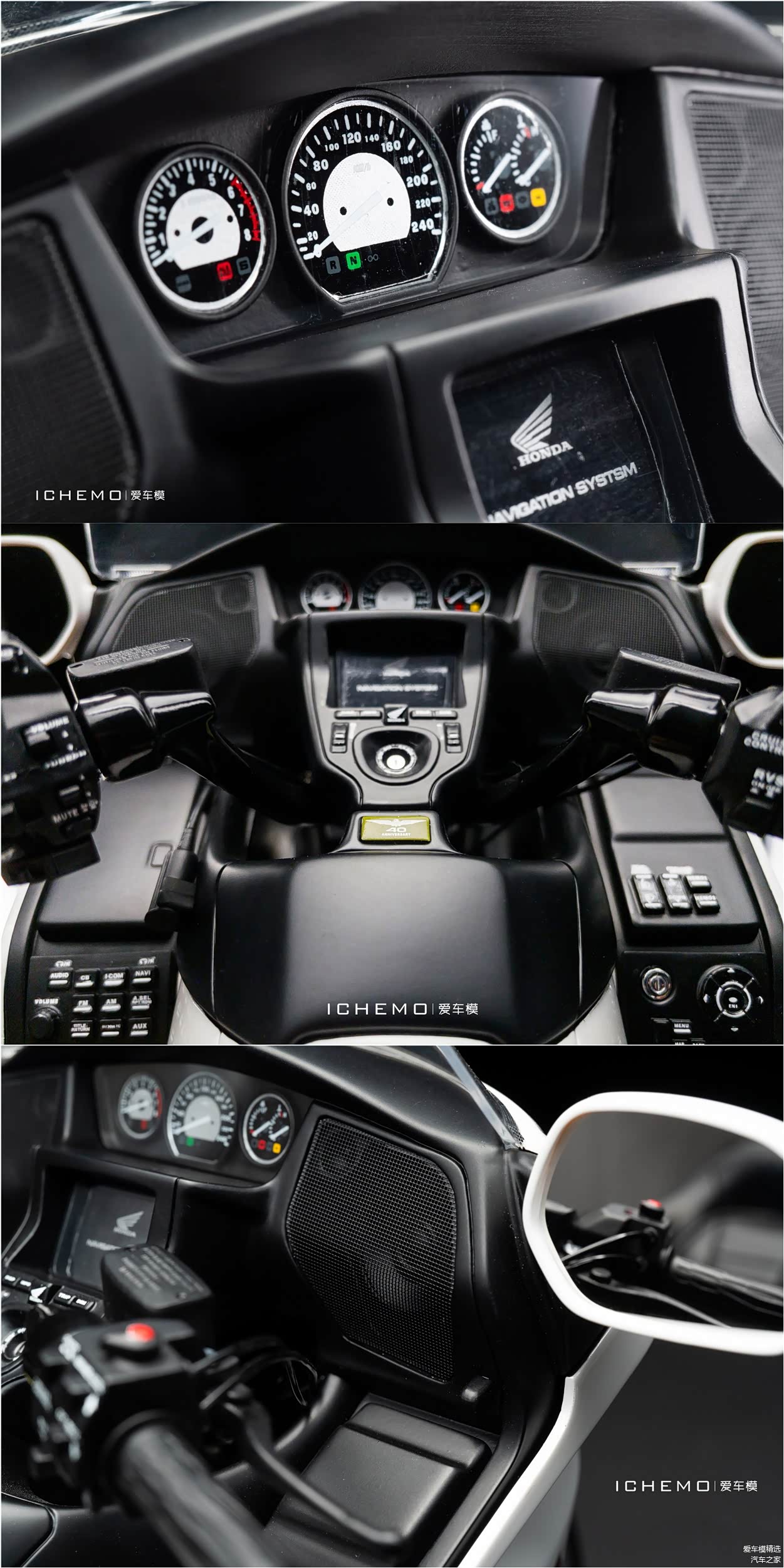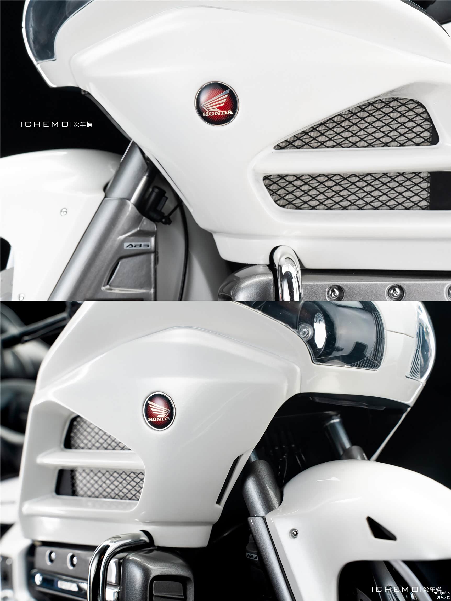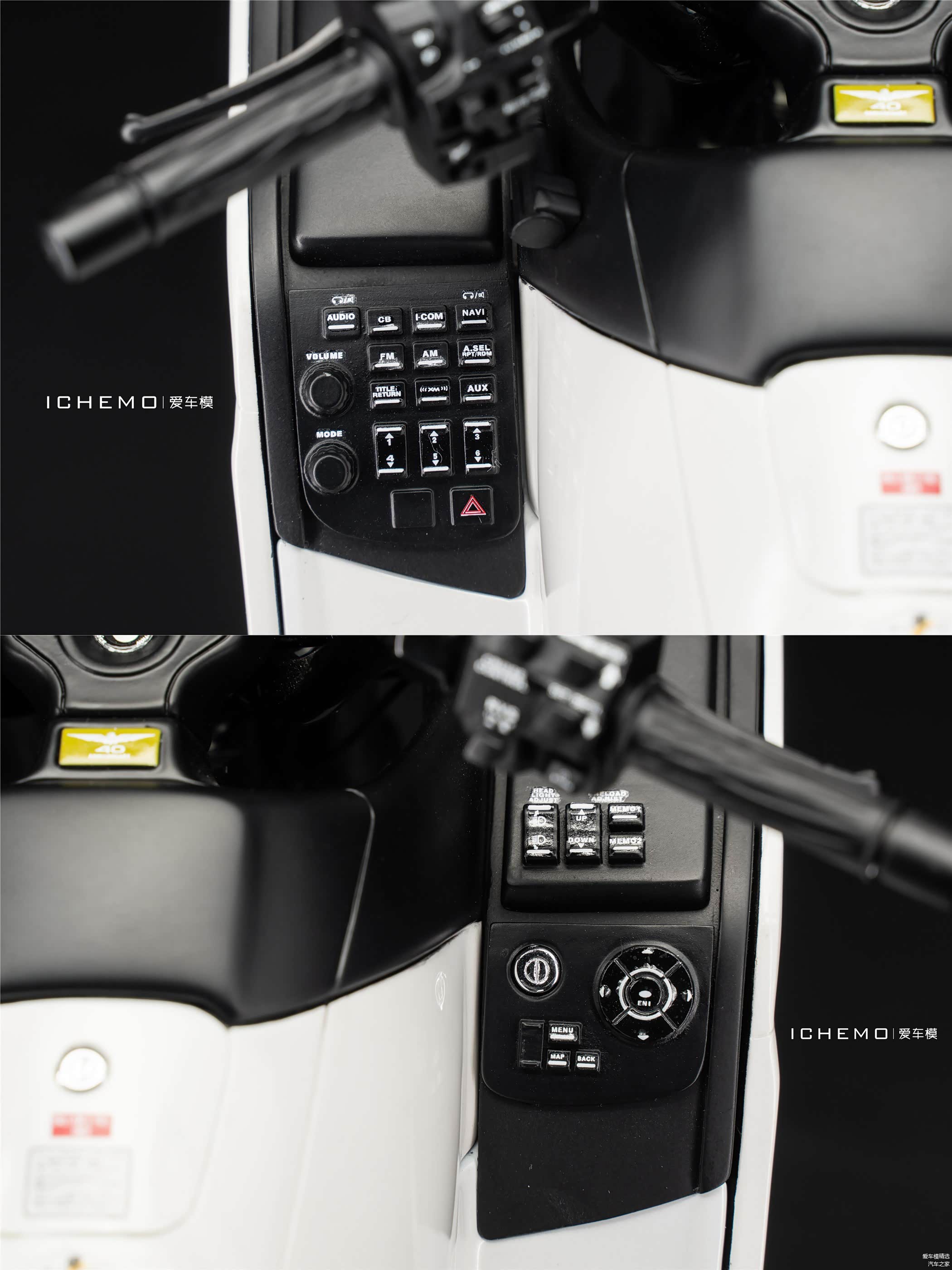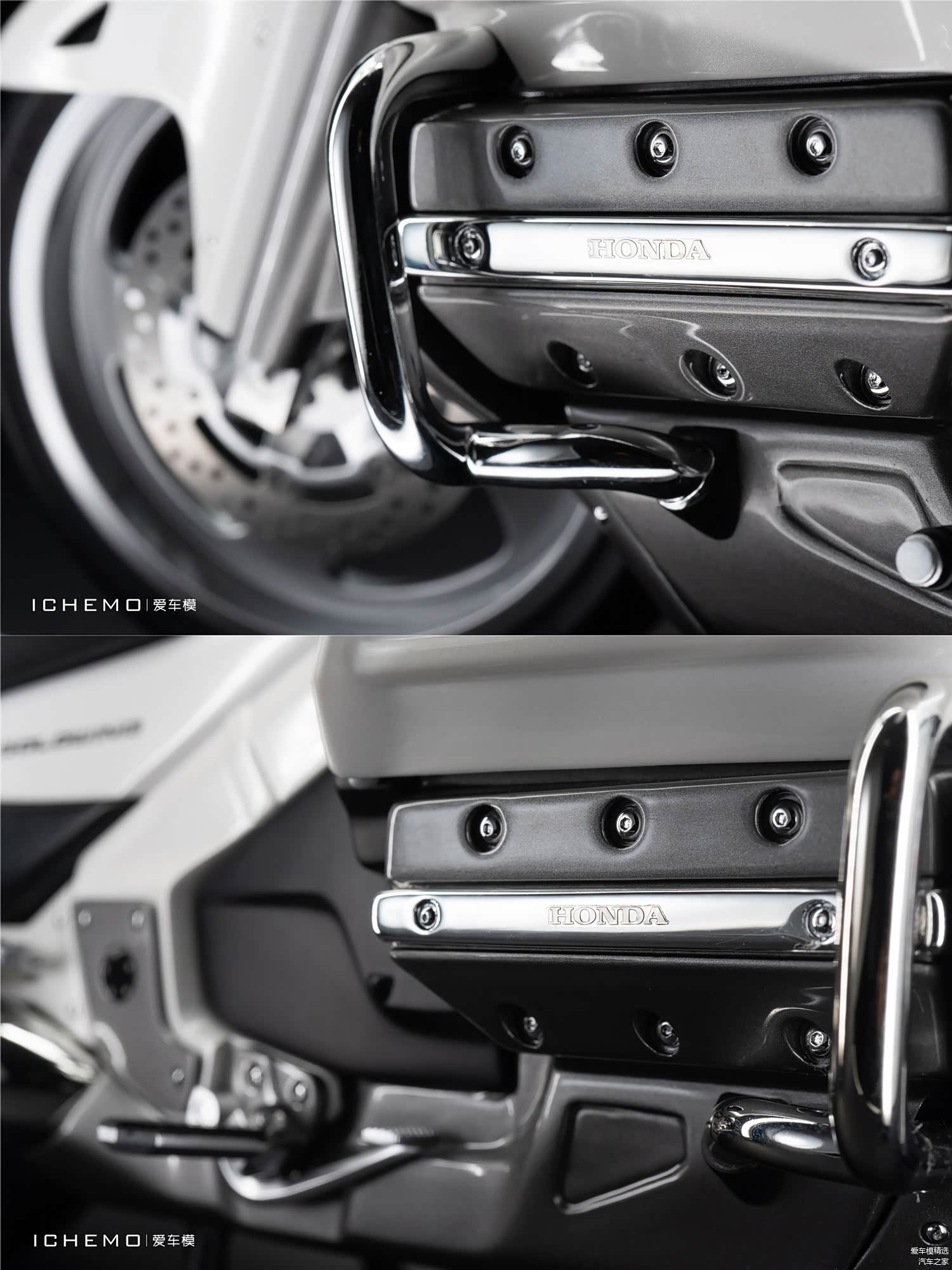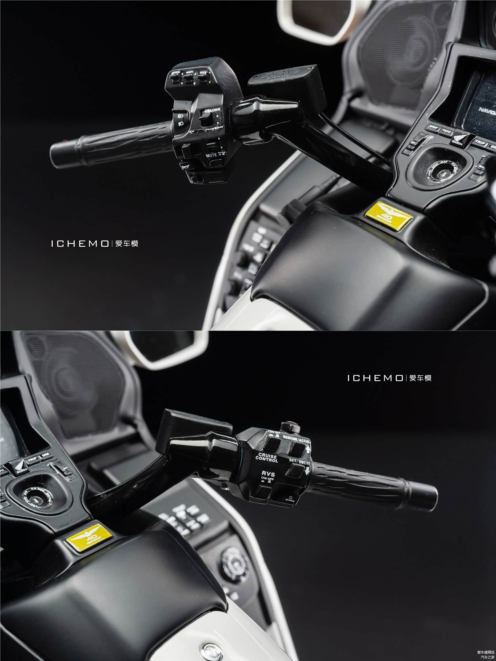 经过把玩与认真对比我们发现,量产品与装饰板样品在可动功能设定上无差异,但在工艺细节方面做了较大修改和提升。据了解,模型在开发过程中也得到了不少金翼车主的帮助。这是此比例维度第一款 Gold Wing GL1800 模型,受到了众多摩托车文化爱好者 - 尤其是金翼车主的关注。