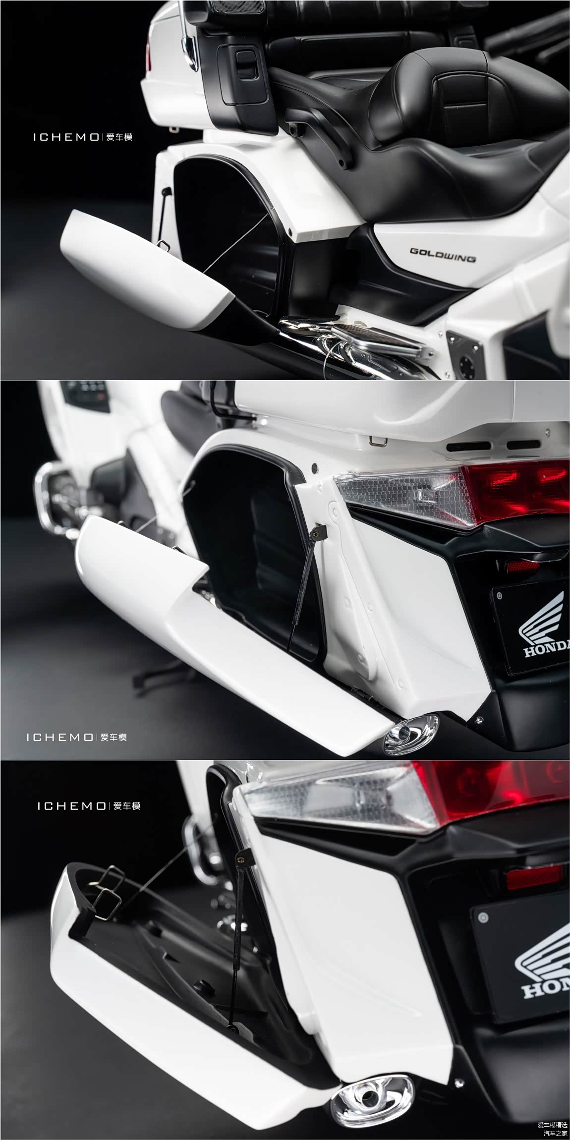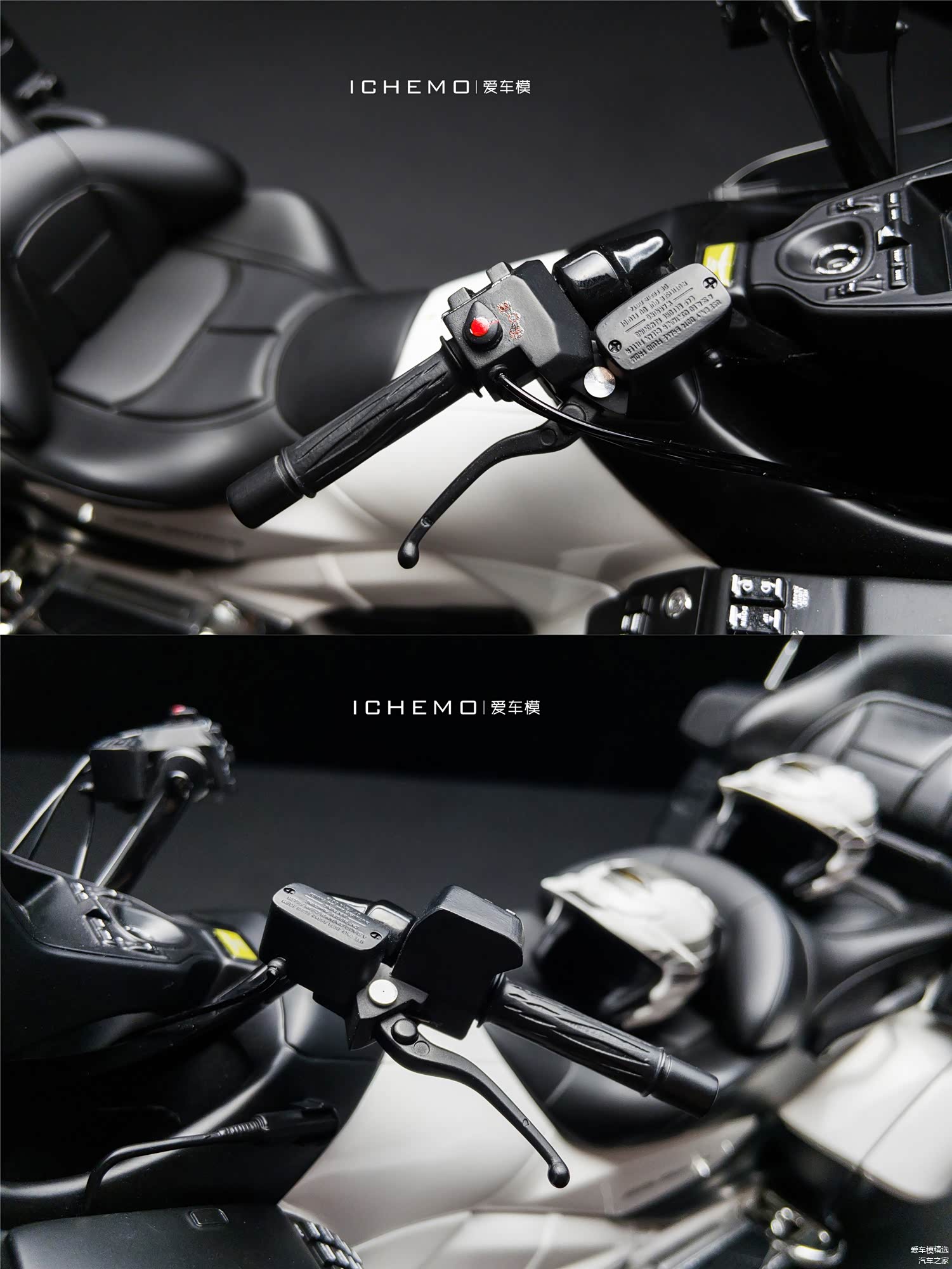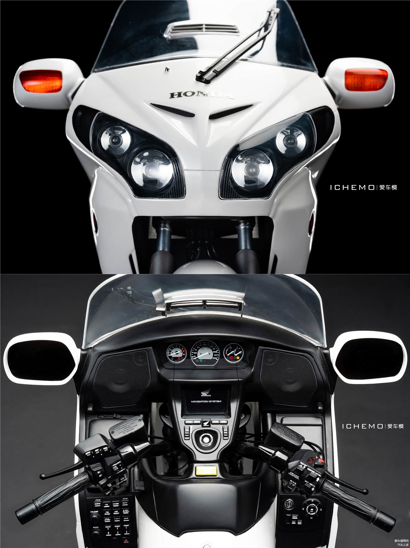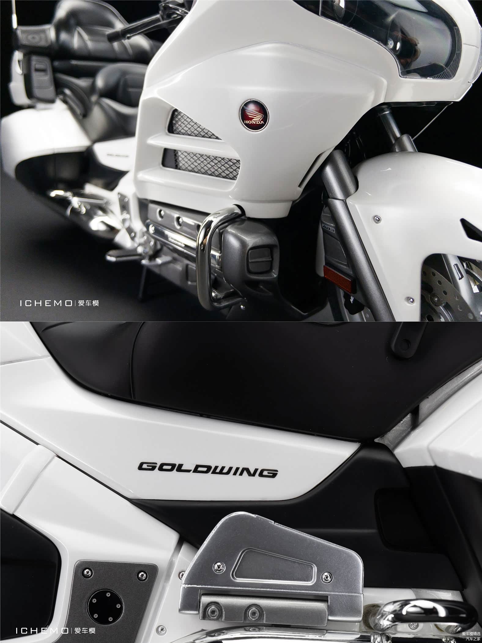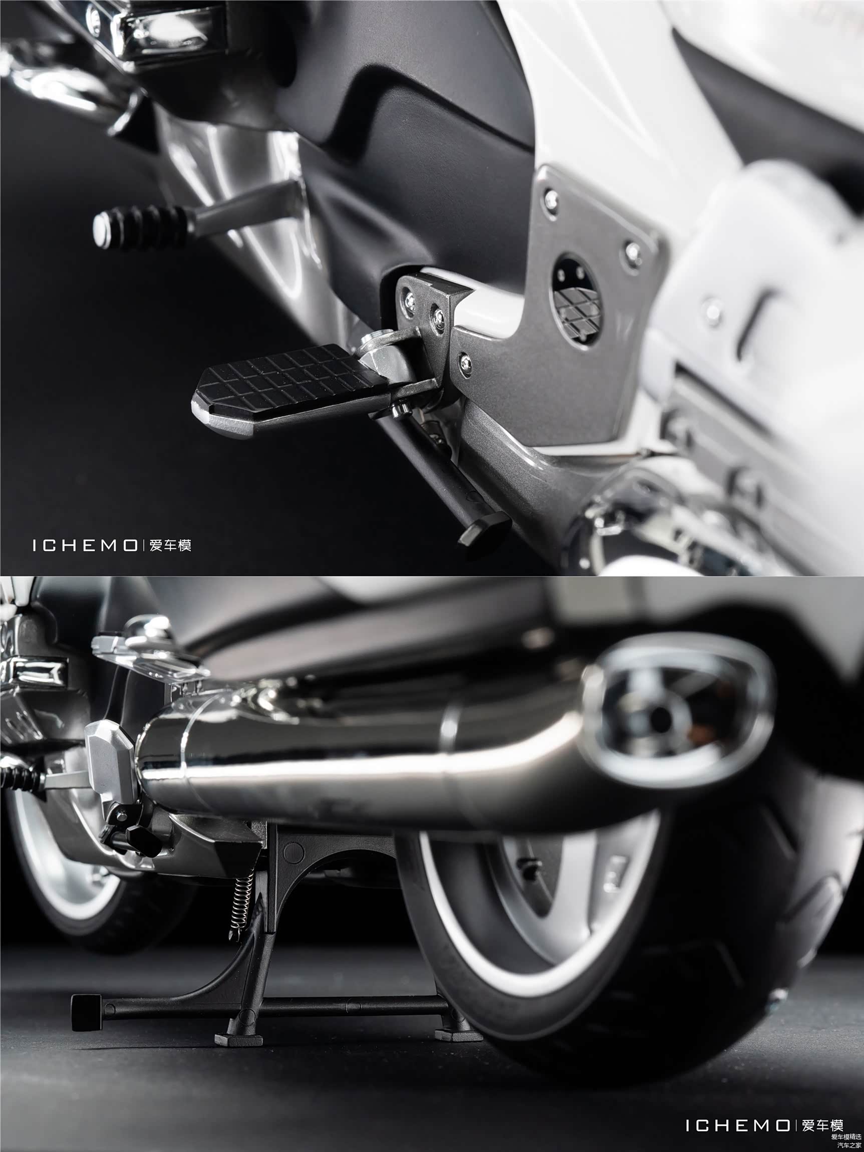 经过把玩与认真对比我们发现,量产品与装饰板样品在可动功能设定上无差异,但在工艺细节方面做了较大修改和提升。据了解,模型在开发过程中也得到了不少金翼车主的帮助。这是此比例维度第一款 Gold Wing GL1800 模型,受到了众多摩托车文化爱好者 - 尤其是金翼车主的关注。