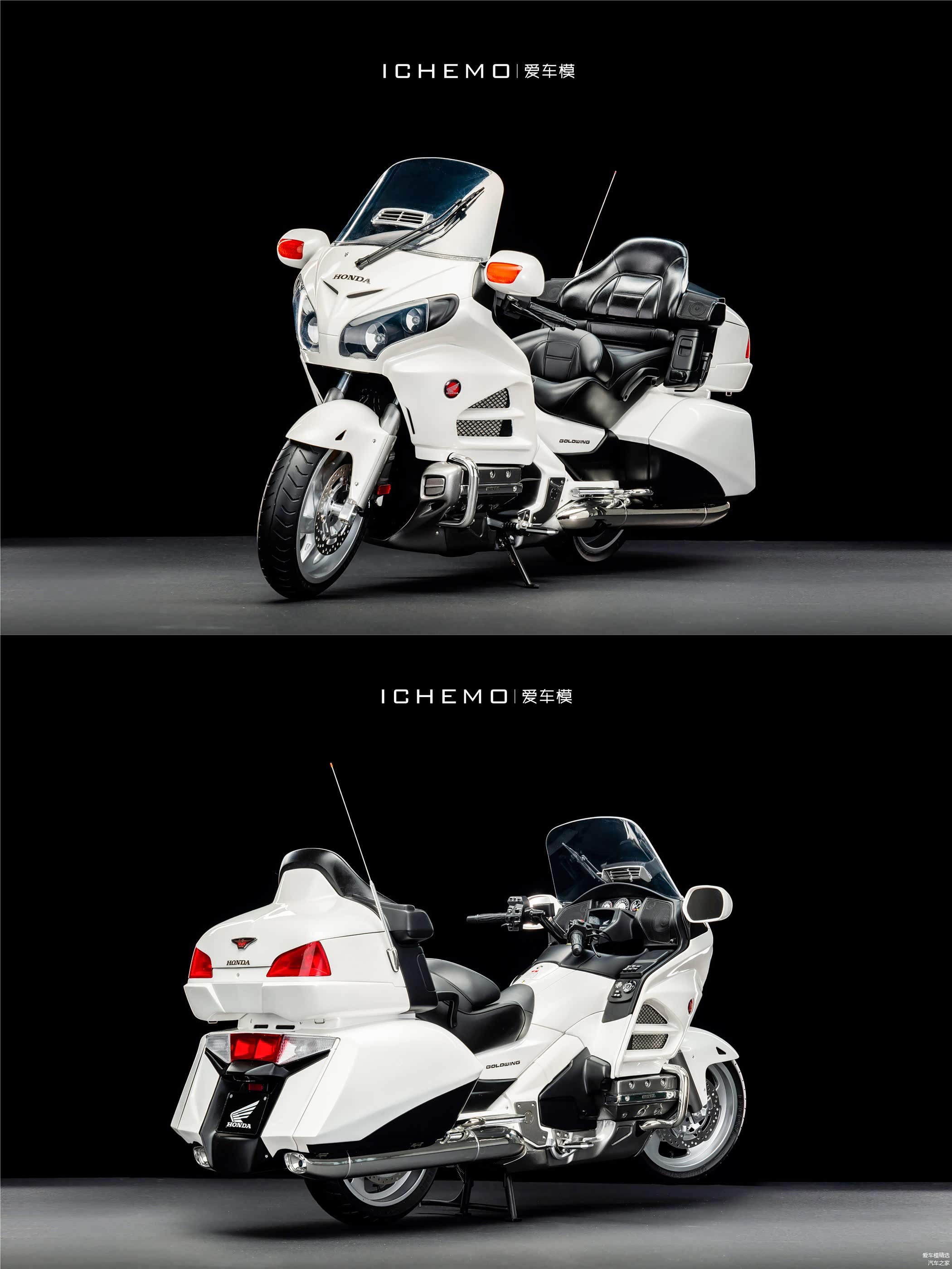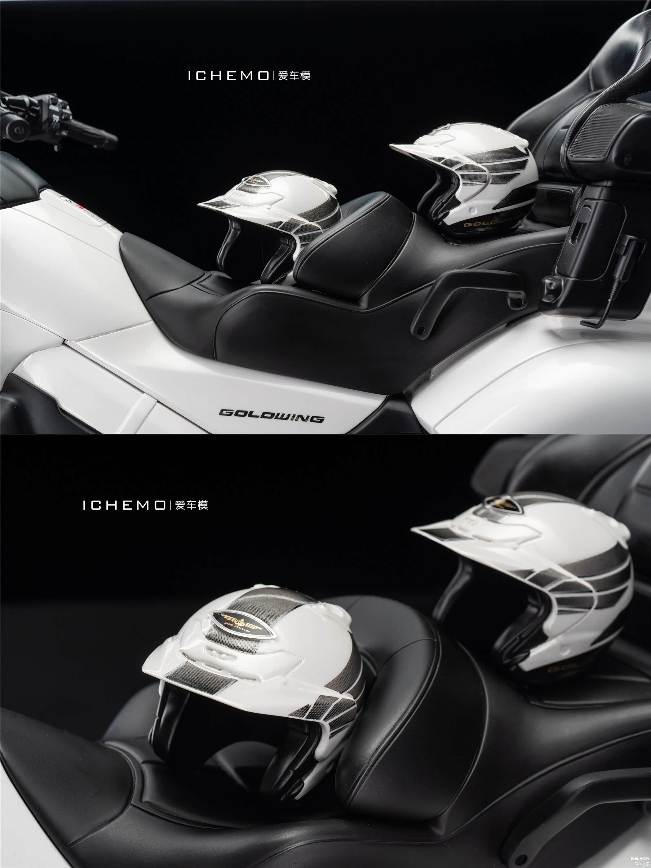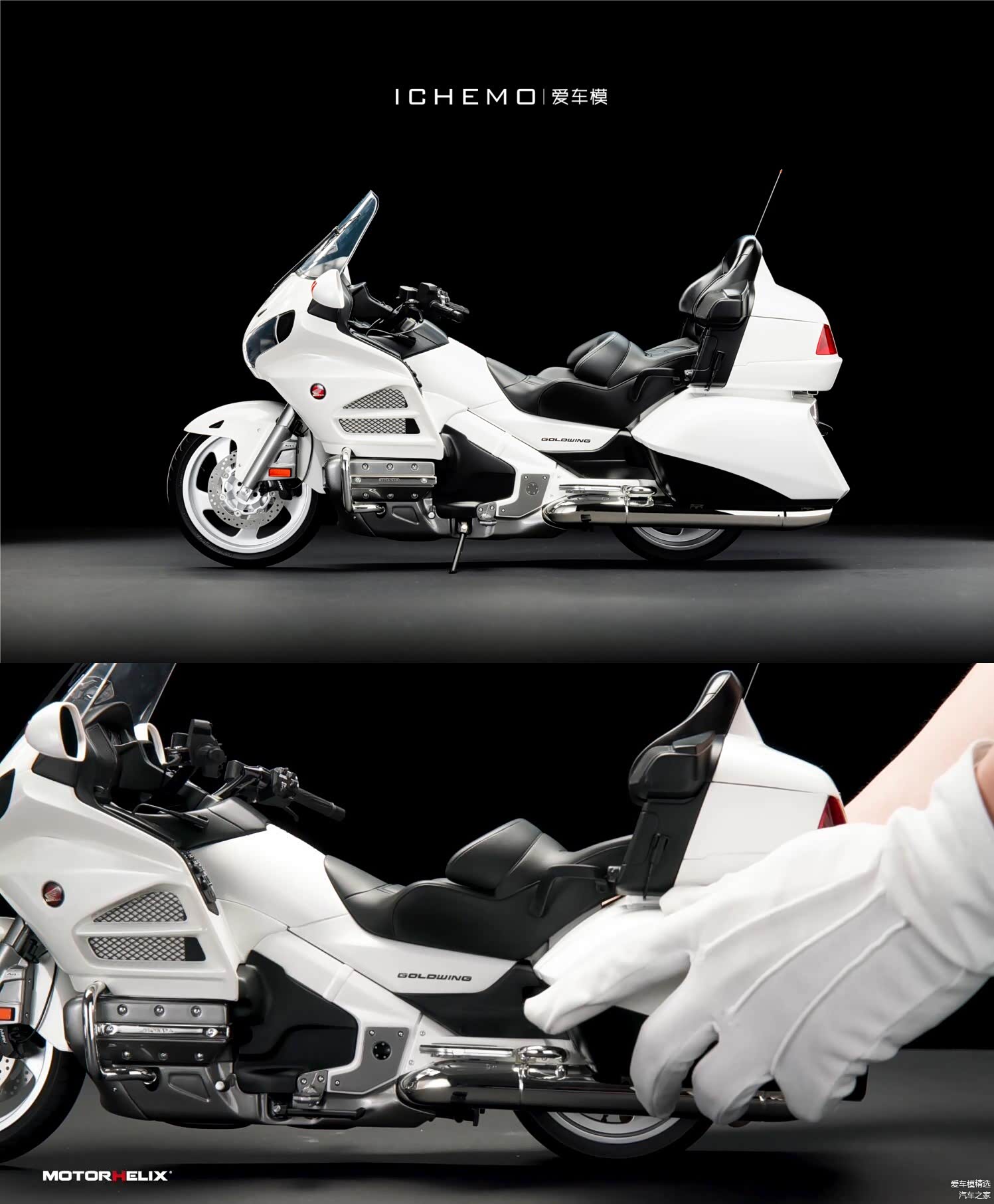 MotorHelix 1:6 比例 Honda Gold Wing GL1800 摩托车模型建议零售价 8699 元/台;附同比例头盔模型 x 2;率先上市的 Pearl Glare White 白色版本限量 299 台,后续会有红、黑、蓝配色;因比例设定和复杂工艺,估月产量 5-8 台,现可预订,按订单顺序发货;Motorhelix 拥有本田 Honda 的官方授权。