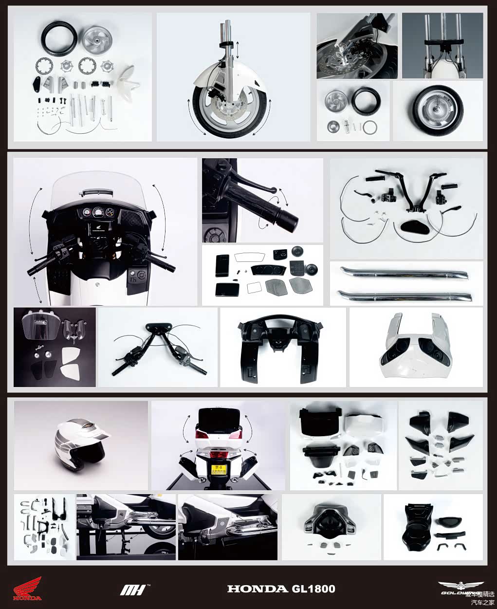 早在 2018 年中国国际模型博览会上,我们就介绍过装饰板样品了。据 MotorHelix 方面介绍,Gold Wing 金翼项目历经三年半时间研发和修改,先后打版 4 次,终于定版量产!模型全车零部件超 500 个,复模件超 180 个(喷油件 111 枚,电镀件 70 余枚),开模件 22 个,合金件超 190 个,磁铁 20 枚,水贴纸 103 张,软胶管 13 处。