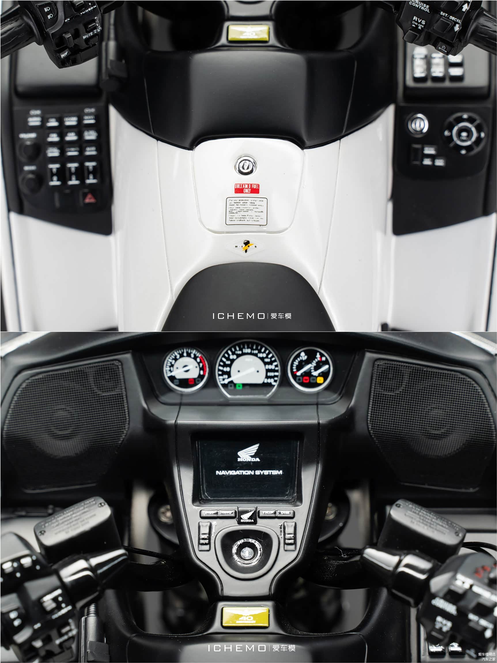视线转到车把/中控部分。仪表、Honda Navigation System 导航屏幕(仅限气囊版)、电控按键区等细节为水贴;SRS CS Auto 80W 6 扬声器音响护罩网为合金件;“40th Anniversary” 徽标、警示标志等亦有刻画。