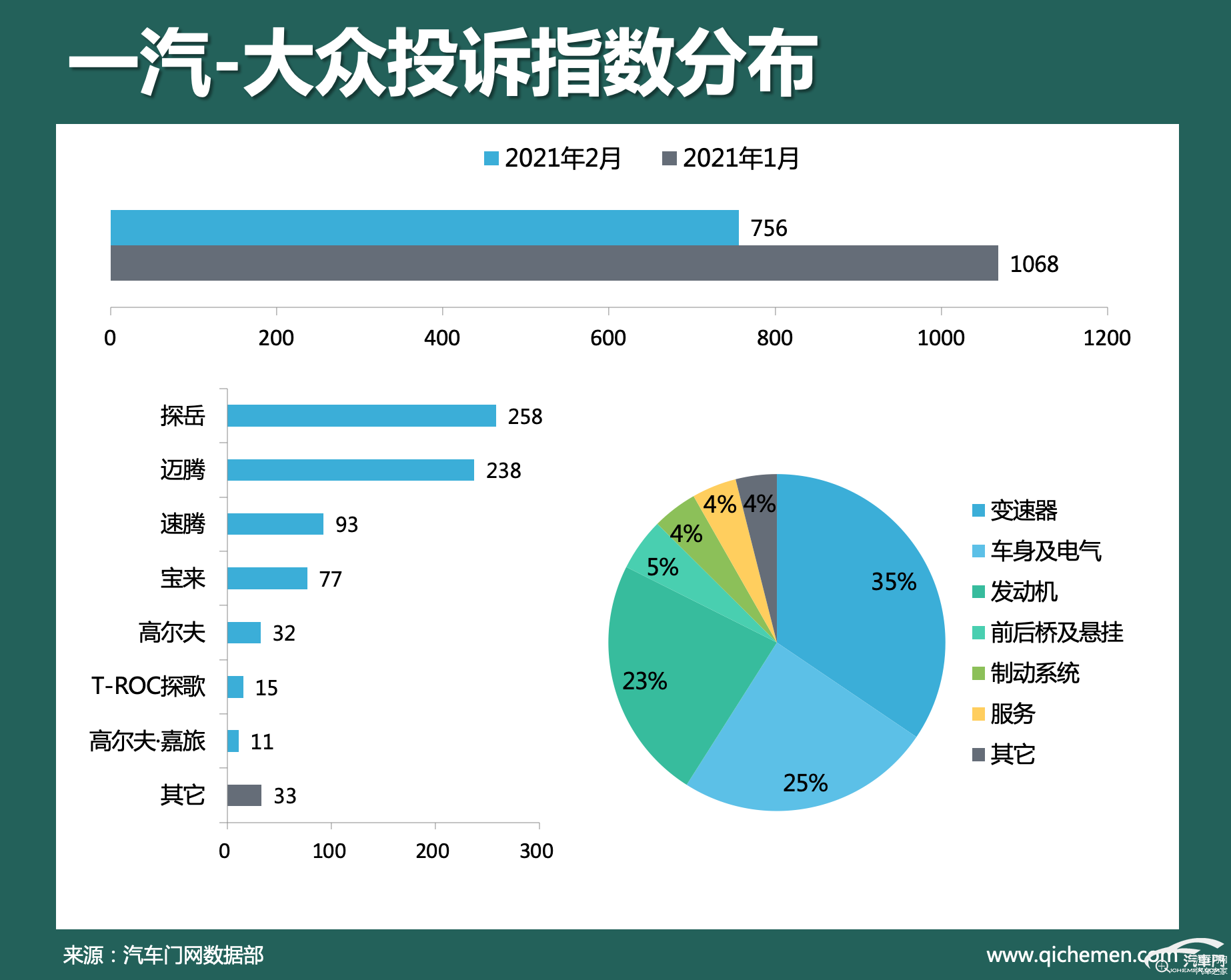 汽车质量投诉点评:变速箱机电单元故障是一汽-大众投诉关键词,旗下热销车型迈腾、高尔夫等纷纷中枪。另外,探岳除了因2019款车型大灯不亮问题被广泛投诉外,2020款新车也被爆出因颗粒捕捉器堵塞造成油耗升高问题,厂商应当重视。