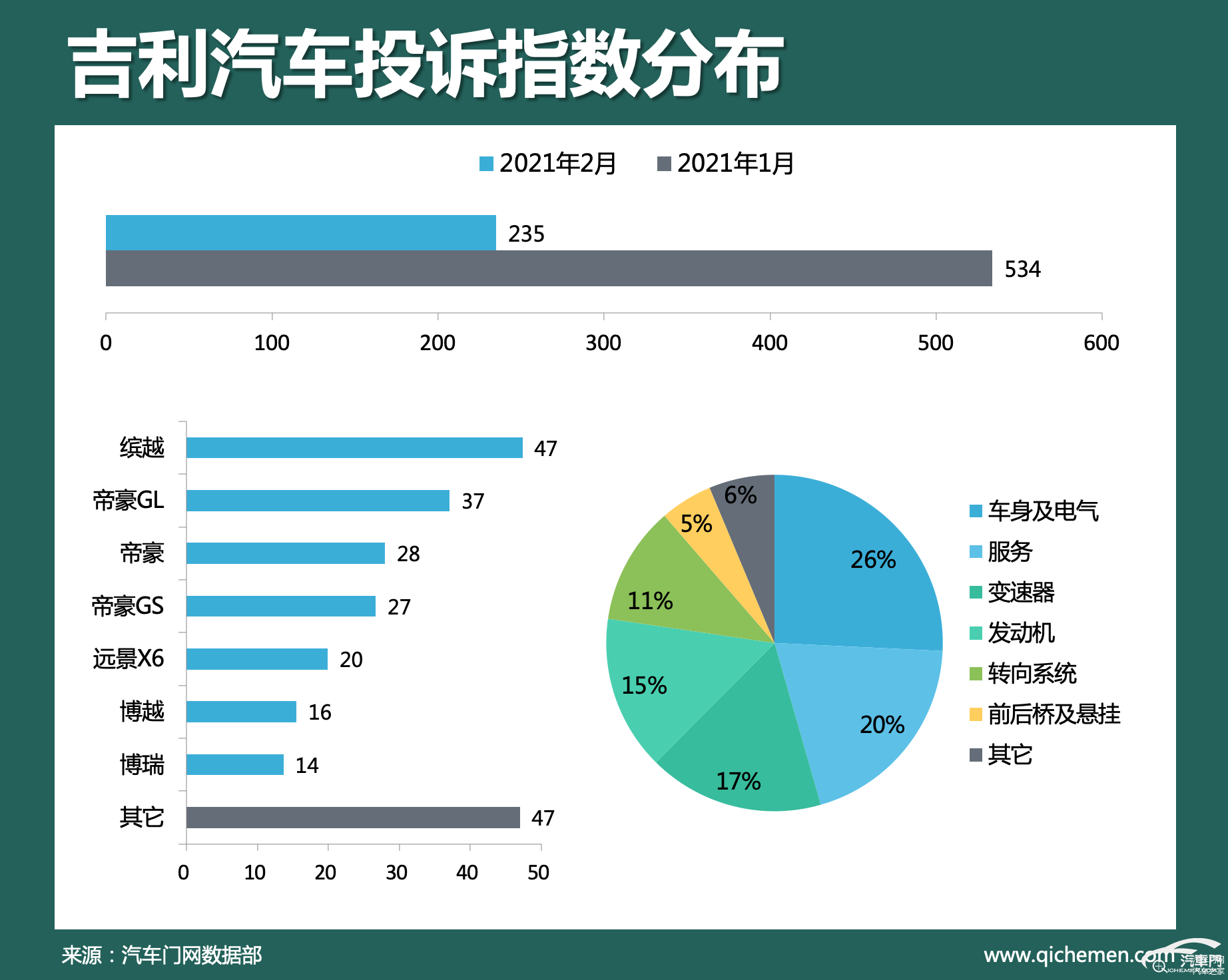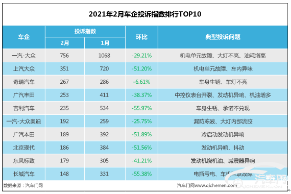 2021年2月车企投诉指数显示,一汽-大众蝉联首位,投诉内容除了持续已久的机电单元故障及探岳大灯不亮外,新增油耗增高问题;上汽大众排名第二,投诉问题以机电单元故障、车内异味为主;奇瑞汽车本月升至第三位,大量车主吐槽车身生锈、车灯不亮问题。