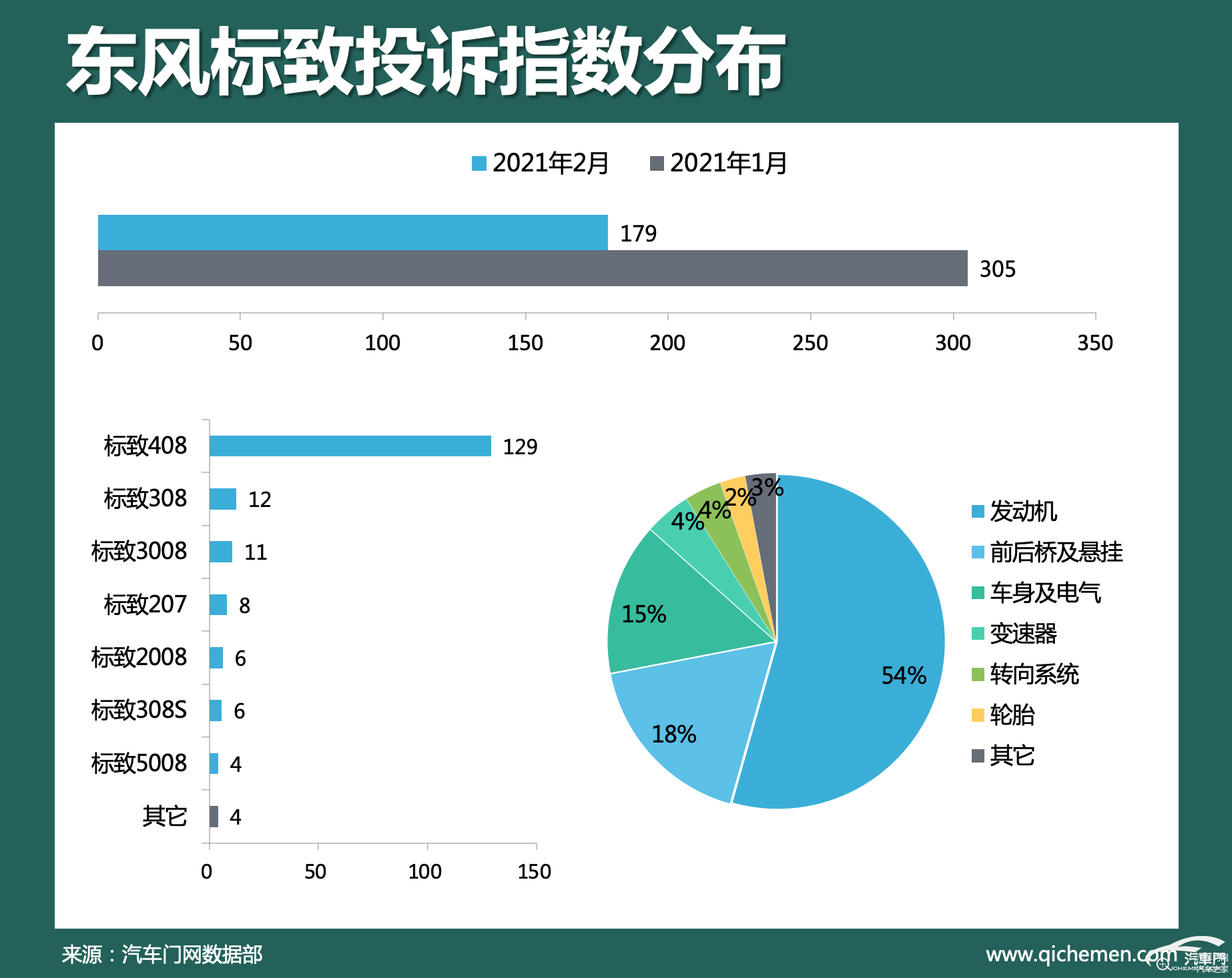 汽车质量投诉点评:东风标致作为榜单常客,投诉顽症仍表现在标致408上。大量车主反馈,老款标致408更换正时皮带后发动机烧机油,并且减震器异响严重。