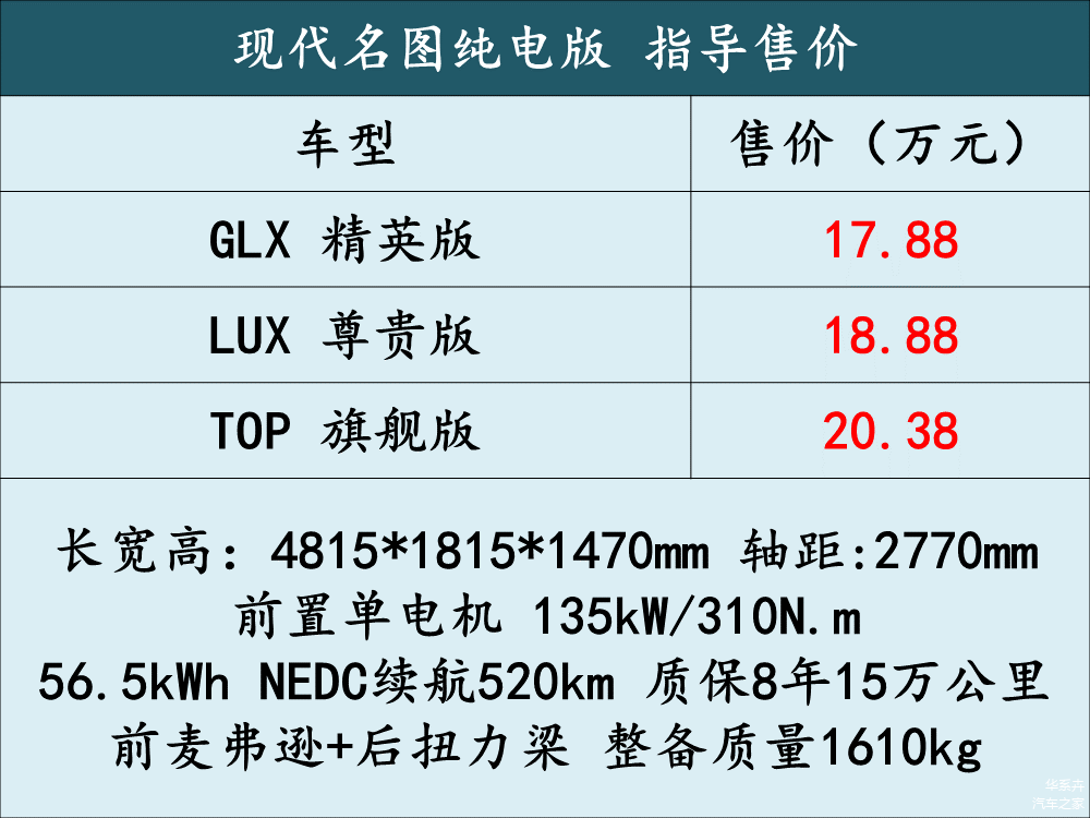 新能源版本车型为三款,售价区间17.88~20.38万元。采用了扭力梁后悬架,车身尺寸更大一点,采用了前置单电机驱动方式,标称520km续航,56.5kWh三元锂电池组质保8年或15万公里,整车质保或五年10万公里。