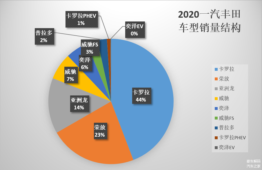 查看一汽丰田车型2020年销量的结构,卡罗拉一枝独秀,占了近一半的销量。这种一条腿走路非常不健康,如果卡罗拉出了问题,后果不敢想象。