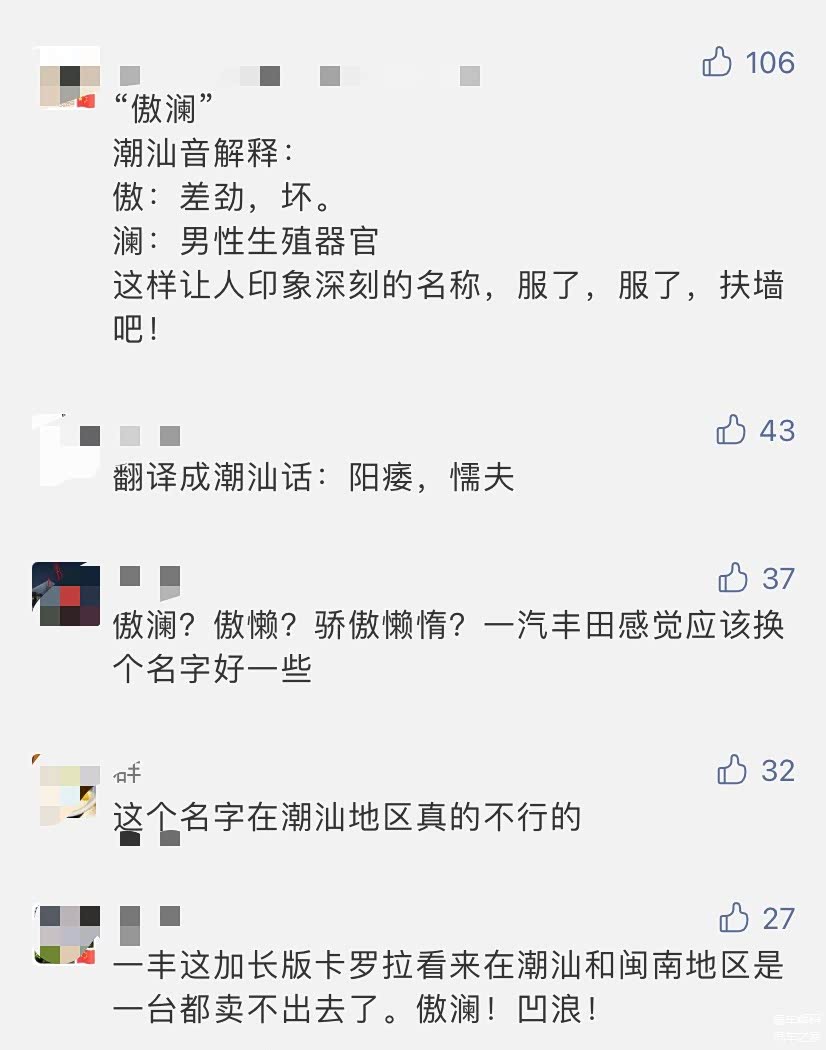 去年11月广州车展首发亮相,当时的官方中文名叫“傲澜”,多么大气豪迈,到今天一汽丰田官网的海报主题还是“傲人生,驭波澜”,但是“傲澜”一经公布,引来轩然大波,原因是“傲澜”这两个字在潮汕地区发音的意思非常不雅。