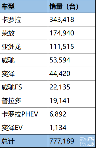一汽丰田旗下产品线非常丰富,却只有卡罗拉一款车是销量担当,荣放、亚洲龙顶着原版车型的光环,在日本北美市场热销,但在国内却差强人意。荣放与CR-V甚至不在一个量级,皓影、奇骏都与之不相上下。小型SUV奕泽与缤智、XR-V的差距更是巨大。