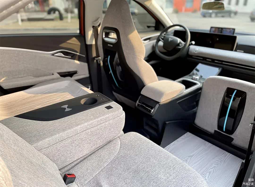 哪吒U网约版后排左侧座椅没有乘客时可以放倒,其座椅背面并不是普通的绒布面。而是设计了置物台、杯托、USB接口、手机无线充电面板。