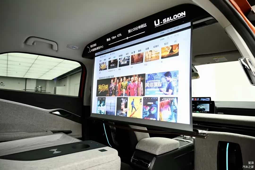 除了信息显示外,这块屏幕下方的拉手下拉,即可出现一块投影幕布。乘客如果乘坐距离较远或是时间较长,看个电影、听个相声也是极好的体验,这是其他网约车还未实现的设计。