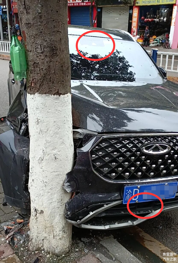 另一个问题就是上图红圈内的ACC自适应定速巡航的毫米波雷达与AEB自动紧急制动系统,综合下来就是ADAS系统为何没起作用,看看上图这角度,再看看后面的马路宽度,恐怕事故发生的一刹那才车头偏向(不是正面朝向)大树,又是一个死角范围,加上距离可能过近,基本上是没法触发系统主动干预制动了(无论是探测雷达还是摄像头,视窗界面都是呈喇叭状对外逐渐扩散的),还好扛住了,损失控制在了一定范围内,就是这右前大灯、发动机盖、右侧机舱支架、前保险杠(最为头疼的就是前格栅与前保险杠是一体型的)等等一套算下来,还真要不少维修费用,虽说网友调侃没把大树撞倒要给个差评,但从这标准的25%偏置碰,还是碰个圆柱体的效果来说,达到了预期的结构设计目的,更关键的这还是副驾驶一侧,看来奇瑞这安全结构层面没白下这么多年功夫。