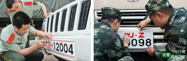 ↑左图为武警2013年车辆牌证,右图为2019年新车辆号牌。图/中国军网
