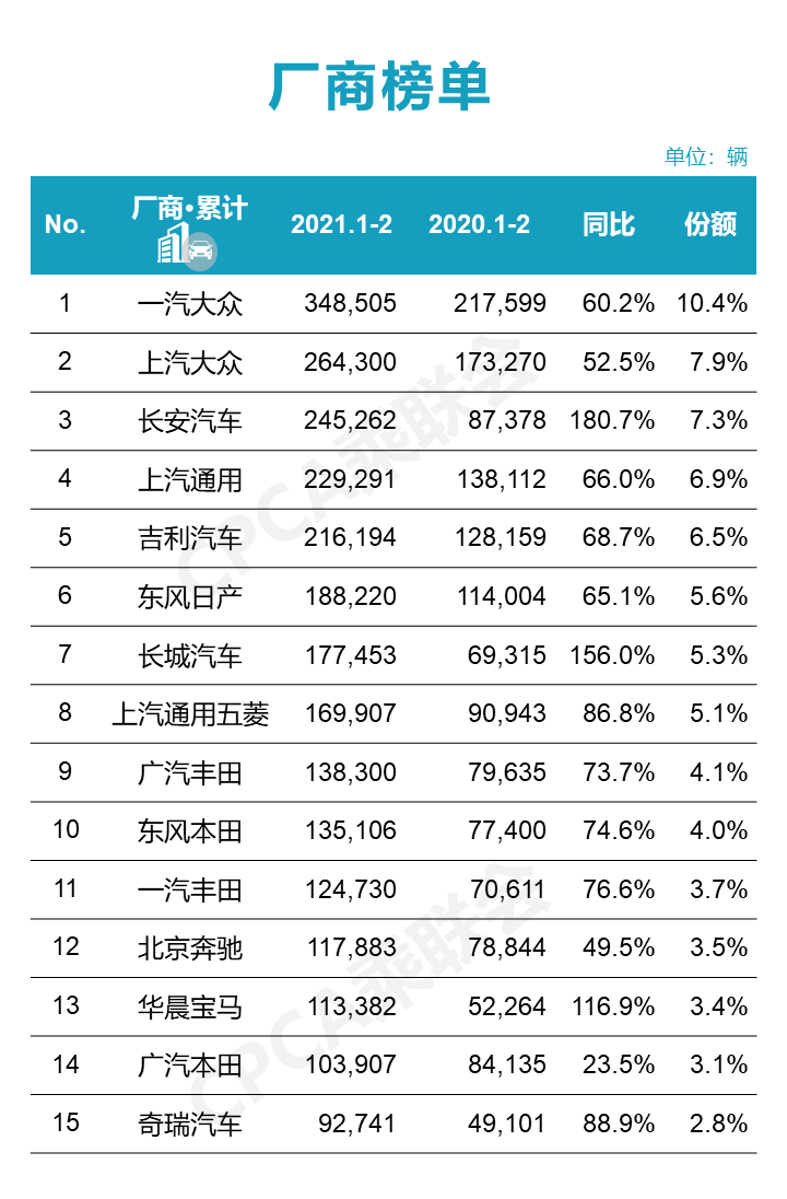 2月份一汽大众、上汽大众继续领跑,两者差距进一步缩小,不到2万辆,为今年冠亚军之争保留了悬念。本月,长安汽车以97289辆位居季军,同比增长7倍,相比1月份前进一位,成为自主品牌“一哥”。