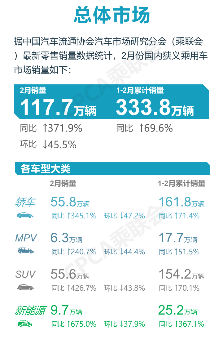 今日,乘联会发布2月份国内狭义乘用车销量数据,本月汽车销量达117.7万辆,同比增长371.9%,环比下降45.5%,鉴于2020年疫情影响销量并不全面,同比2019年2月增长0.3%;1-2月份累计销量333.8万辆,同比增长69.6%,主要是因为去年同期销量基数比较低导致,这也是汽车零售数据统计16年以来同期增速的历史新高。