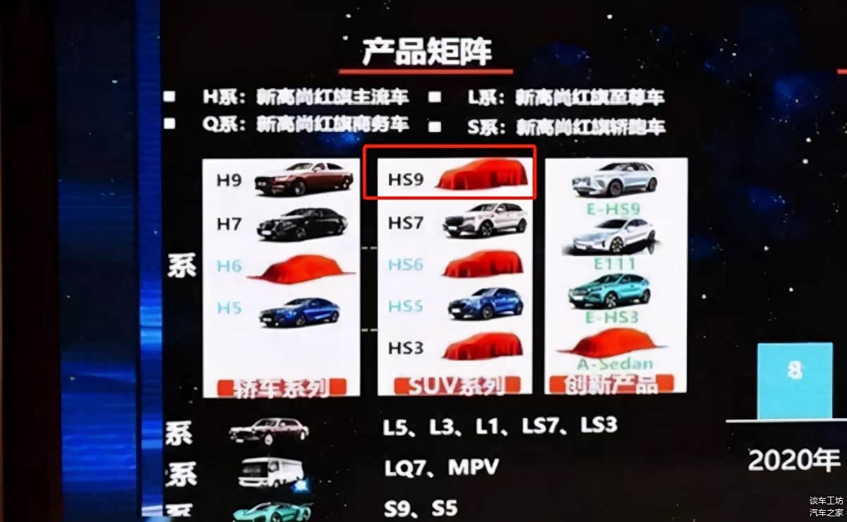 红旗在去年12月推出了一款大型SUV,超豪华的外观设计以及超过5.2米的车长都是国产SUV的首次出现,引起了业内不小的震动,新车当时只有纯电款还是令不少车迷有些失望。不过这么好的一个登上豪车舞台的机会,红旗怎么会放过,从一汽红旗近日曝光的产品规划我们能够发现,红旗HS9被蒙上红布,摆在了SUV车型序列最顶端的位置,想必新车很快就会跟观众们见面。