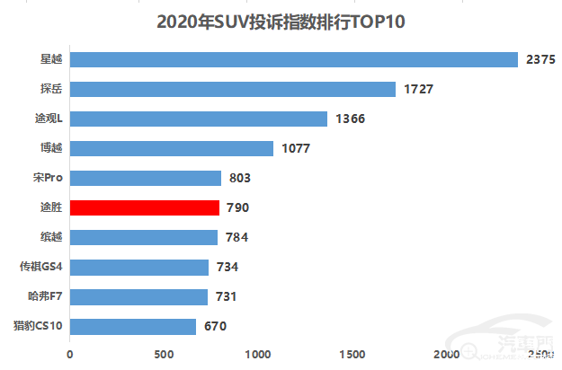 汽车门网投诉数据显示,2020年途胜投诉指数为790,在SUV投诉排行中排名第六。需要补充的是,除了排在第十名已经停产的猎豹S10外,其它上榜车型大多为热销车型,销量表现远超于年累计销量仅有31357辆的途胜。相比之下,途胜的产品质量问题突出。