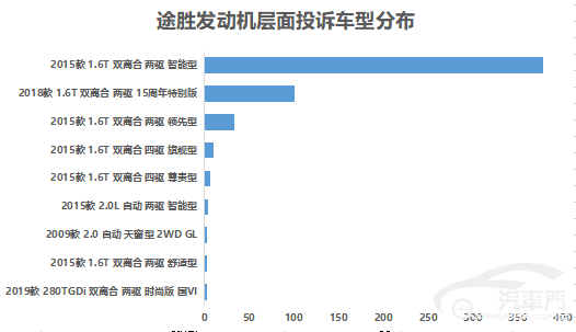 为了进一步探究途胜发动机投诉高居不下的原因,汽车门网将数据再整理,发现2020年途胜发动机层面问题车型分布广泛,2009款、2015款、2018款和2019款批次车型均有涉及。其中,2015款 1.6T 双离合两驱智能型投诉指数占比最高。