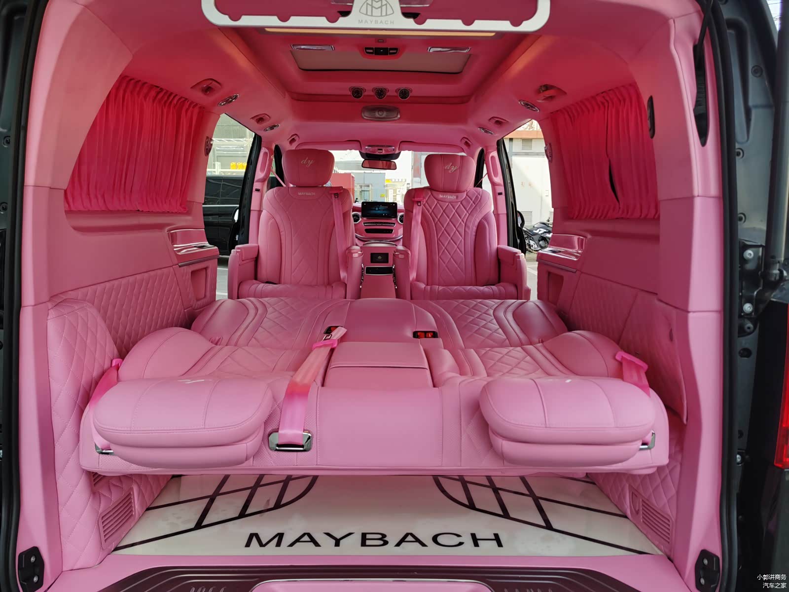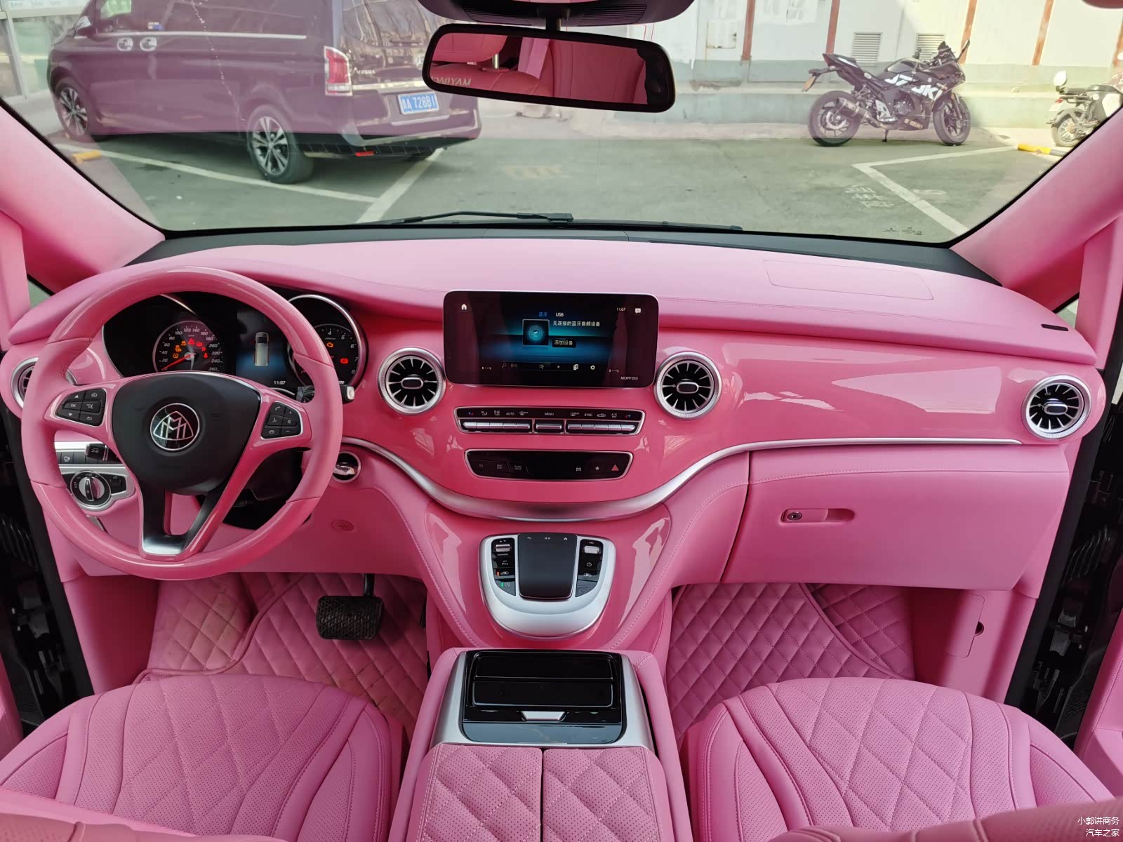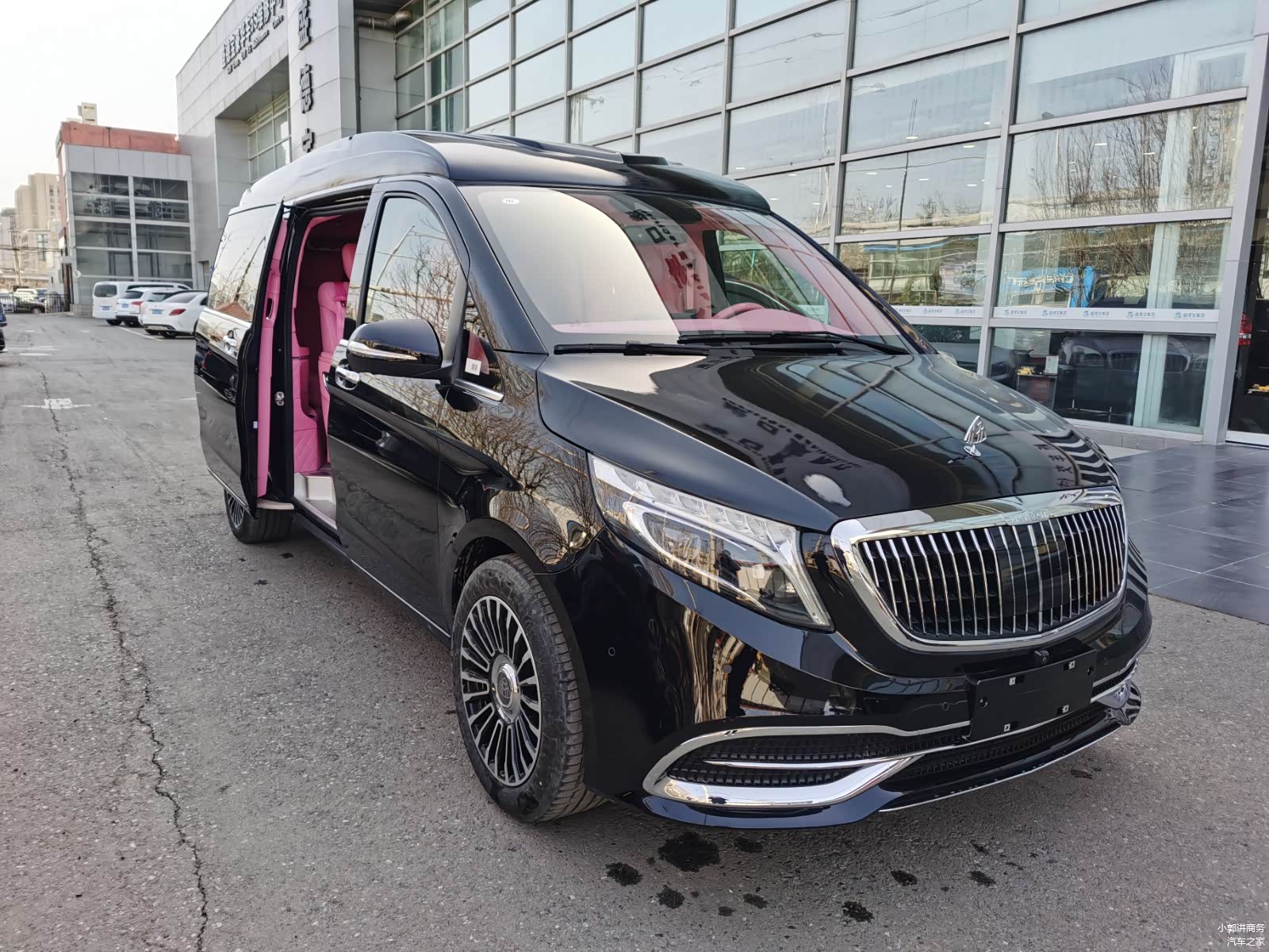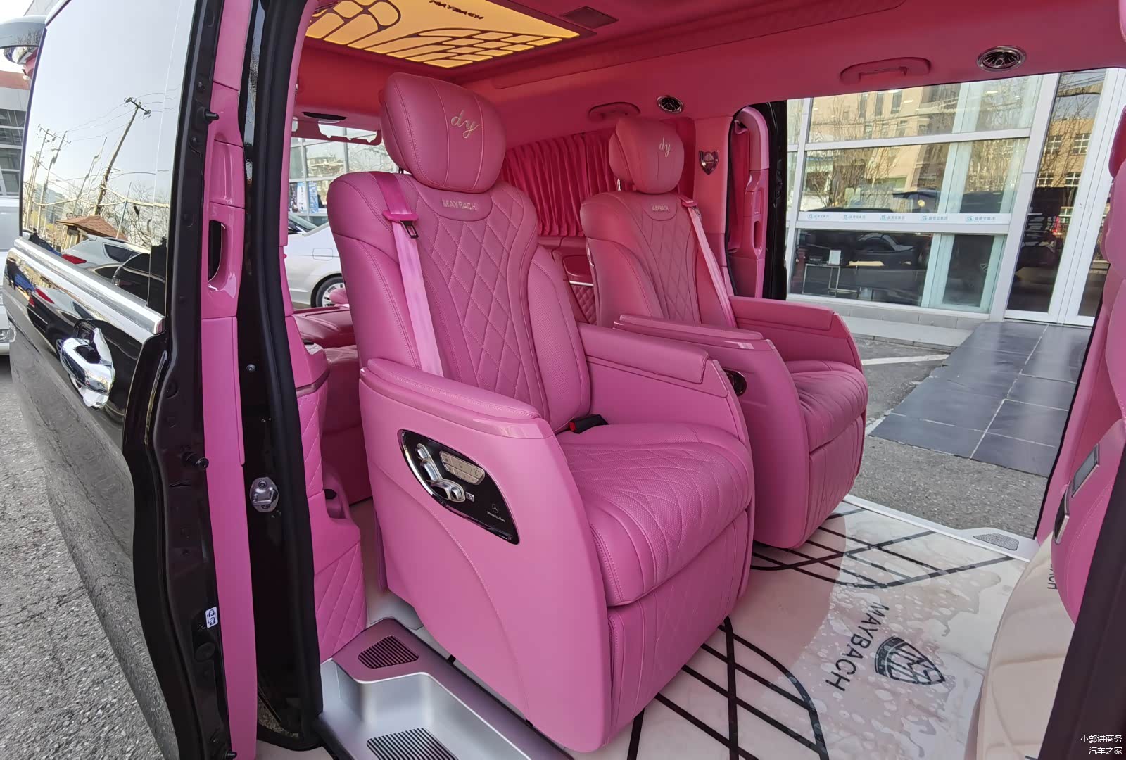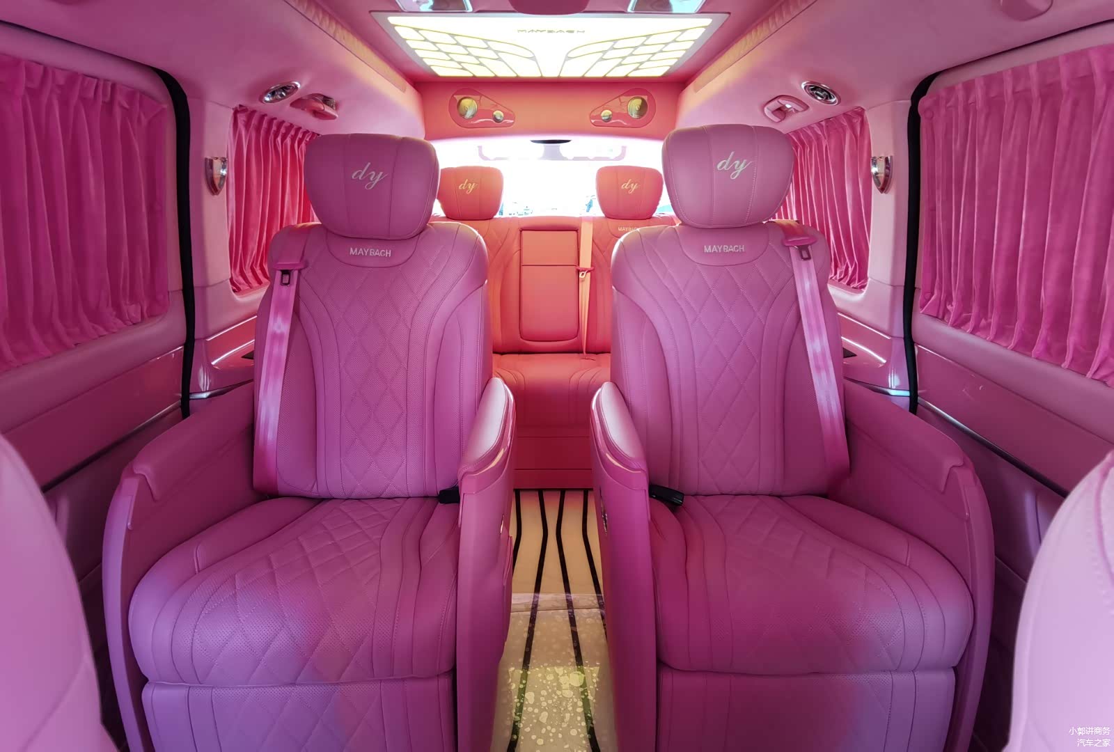 Hello,大家好,欢迎收看小郭讲商务,我是你们喜欢的小郭,今天给大家分享的这款案例是一个小姐姐的定制改装案例,小姐姐非常喜欢粉红色,所以定制了这款车型,下面就让我们看一下这款车吧,2021款奔驰v260l高顶七座商务车,这款车采用2021最新款的奔驰V260L尊贵加长版9速升级的迈巴赫VS980L商务车,原车配备空气悬挂,这款车的前包围升级为迈巴赫家族式的前脸,并且升级了迈巴赫立标和高顶,升级之后的尺寸是5.4米*1.928米*2.08米。