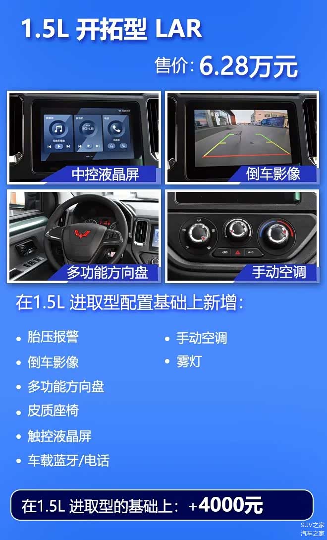 至于消费者怎么选择,其实通过两款车型对比之后也很容易做出决定。如果说进取型是标准版的话,那么开拓型就算是进取型的进阶版。两款车型相差4000元,但开拓型却多出了胎压报警、倒车影像、多功能方向盘、8英寸中控屏、皮质座椅、车载蓝牙/电话、手动空调以及车前雾灯等功能,多项配置的加持,不仅让驾驶者的用车更加便捷、安全,也有着突出的性价比。因此,我们更为推荐6.28万元的开拓型。