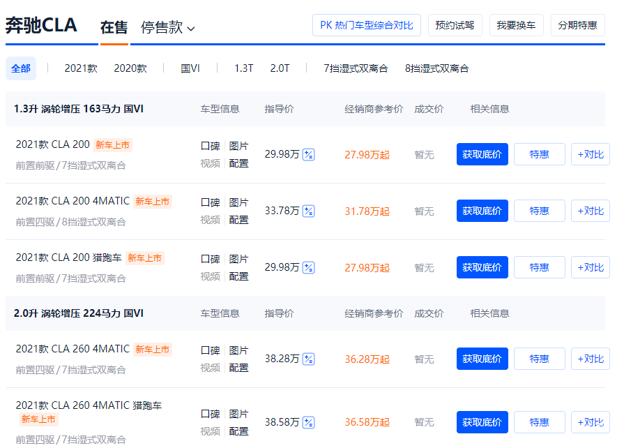 奔驰新款CLA家族共推出了5款车型,其中四门轿跑版新增了CLA 200 4MATIC车型,售价区间为29.98-38.28万元;猎装版共包含2款车型,售价区间29.98-38.58万元。