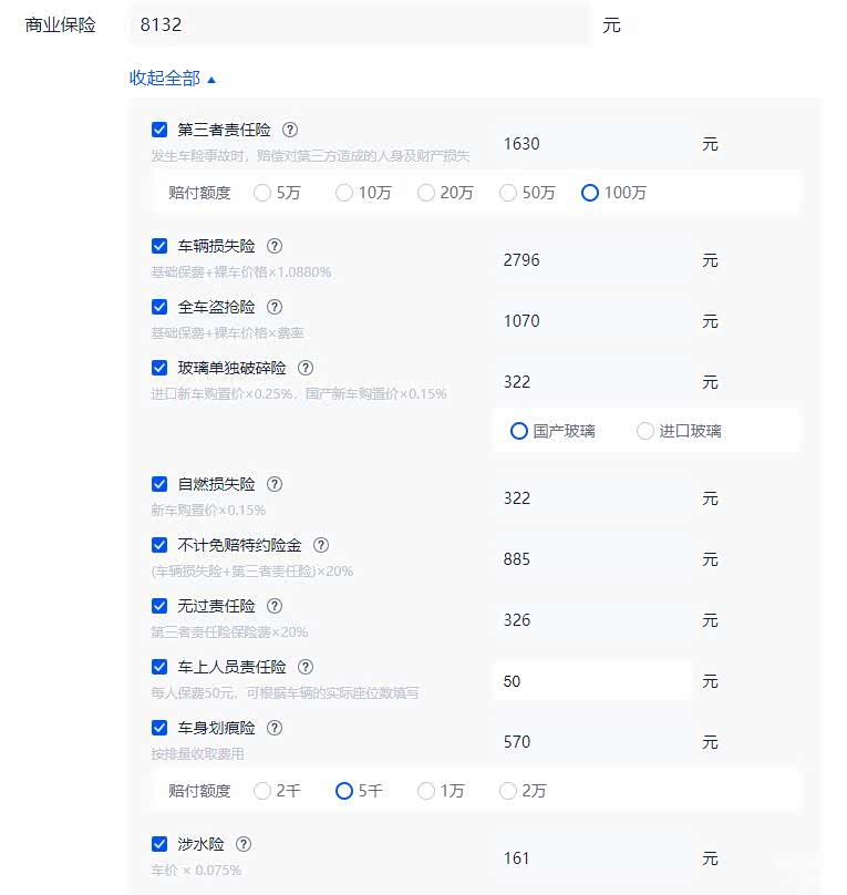 买车还必须买保险,下图中为车辆全险(以销量最高的2019款 改款 2.5G 豪华版为例),如果觉得没有必要的话可以自己减去一些相应的费用,但是如果是新手的话,有时候全险还是很有必要的,保险经过了改革,每个人不同时间算的价格都有所不同,还要以自身实际为准。
