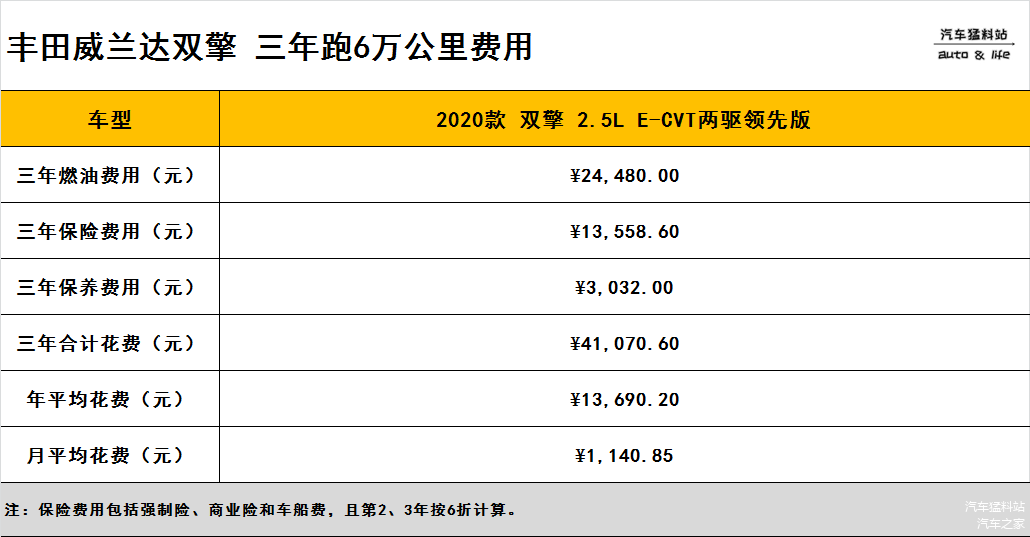 通过上述计算,我们就能得到丰田威兰达双擎的养车成本,具体如下: