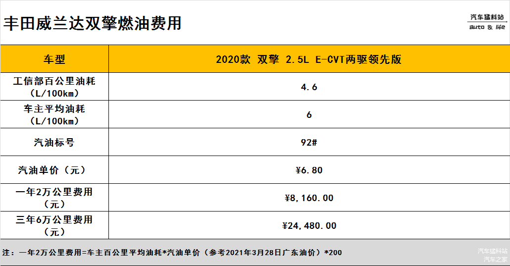 简单回顾完威兰达的表现,我们再具体讨论养车成本。养车成本种类繁多,像维修费、道路通行费、停车费、美容费等也是因人而异,这些太过个性的费用我们不作讨论,这里重要分析三类共性的养车成本:燃油费用、保险费用、保养费用。为此,我选取了热度较高的2020款 双擎 2.5L E-CVT两驱领先版作为分析车型,来具体看看威兰达的养车表现。