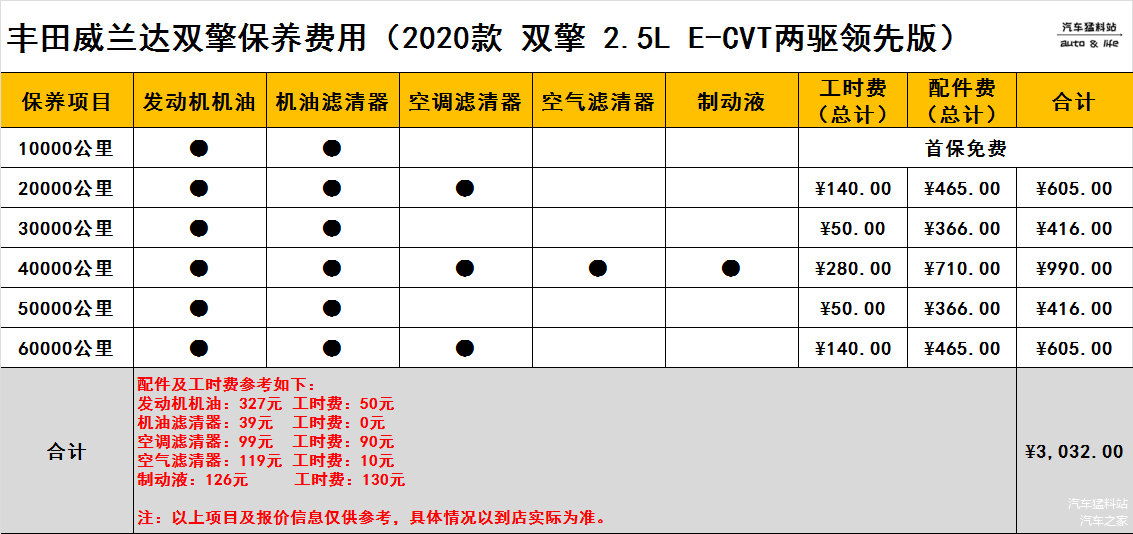 从上表可知,假如丰田威兰达双擎三年跑了60000公里,那么过程涉及的保养项目包括发动机机油、机油滤清器、空调滤清器、空气滤清器、制动液等,合计费用预估为3032元,相当于每年花费仅1000元出头,基本无压力。