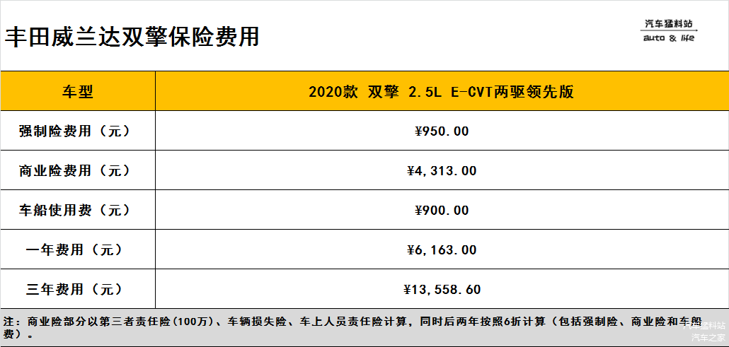 影响保险费用的关键在于车身价格以及所选择的险种,而这台低配威兰达双擎的具体表现如下: