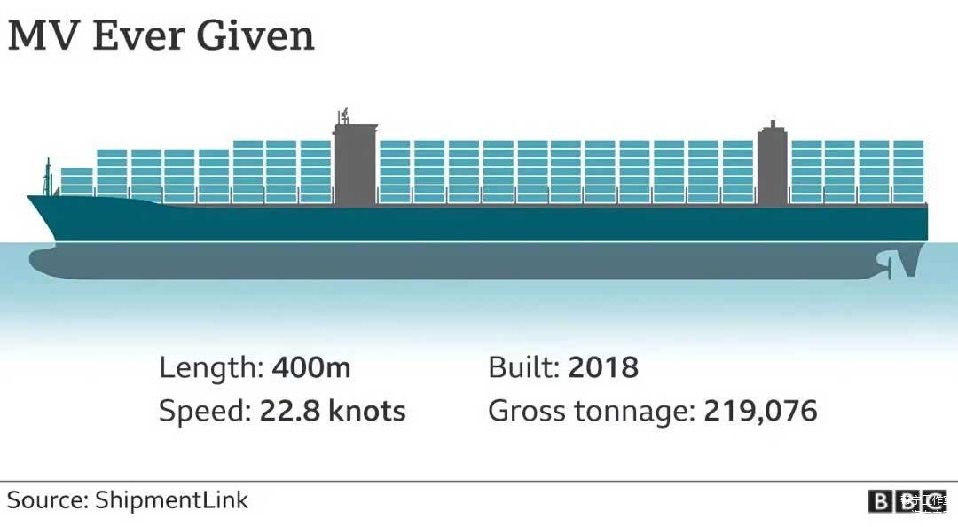 2021年3月23日,长400米、宽59米、重达22.4万吨的长赐号货轮驶入苏伊士运河。由于40节的大风和沙尘暴夹击,导致能见度低和航行困难,偏离航线而搁浅。