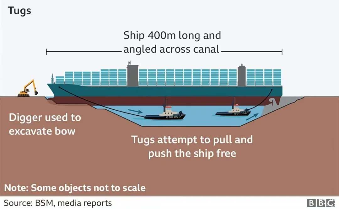打捞人员已经尝试了各种补救措施:用拖船拖曳,在船体下方挖泥,并使用挖掘机挖掘船头卡住的东岸。但截至3月26日晚上,这艘大船仍然一丝不动。