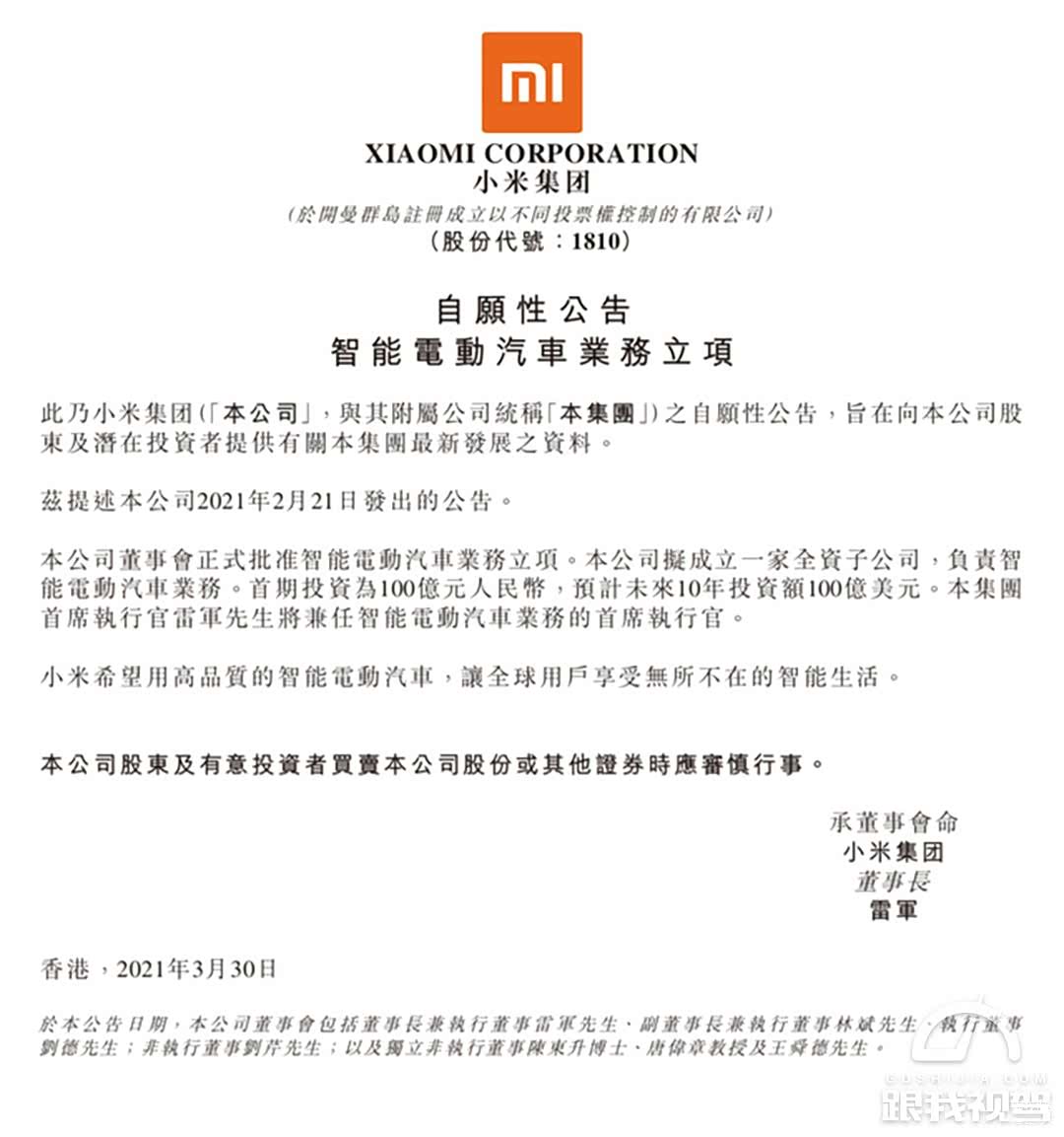 3月30日,小米集团在港交所发布公告,宣布小米智能汽车业务正式立项;同日,在小米春季新品发布会上,小米集团创办人、董事长兼CEO雷军宣布,小米正式进军智能电动汽车行业。