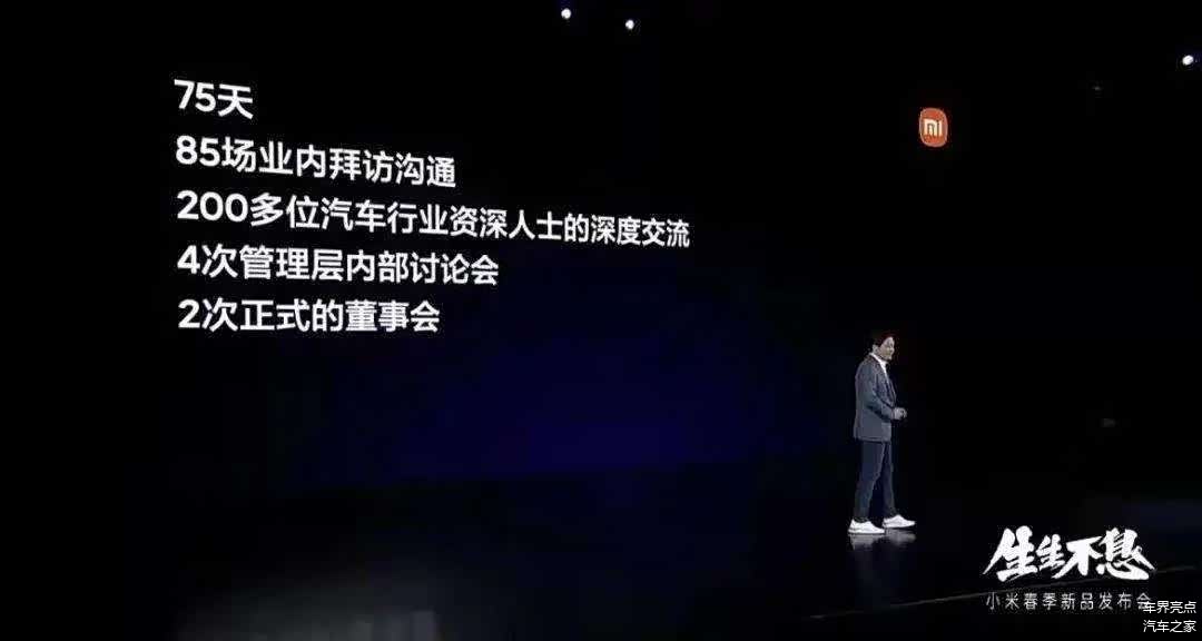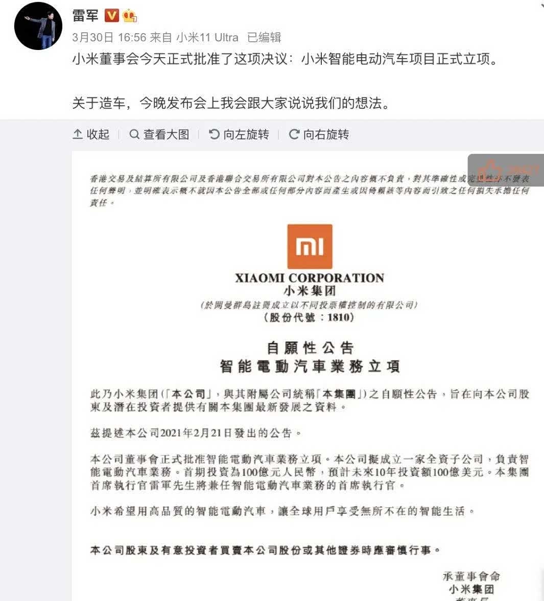 虽然发布会前雷军通过微博剧透了这个决定,小米也发布了正式的签章公文,但发布会上雷军的亲自公布似乎才让小米造车的官宣最终走完了仪式感。