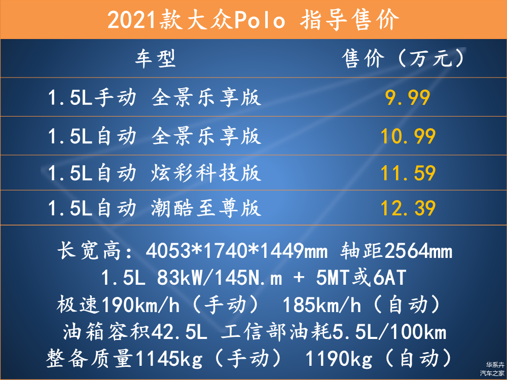 新车推出了四款车型,一款手动挡车型,三款自动挡车型,售价去接为9.99~12.39万元。车身长度超过了4米,轴距接近2.6米,全系均搭载1.5L发动机,匹配5MT和6AT变速箱,极速还是比较高的,相对与法定限速来接,车辆安全设计裕度高。小型两厢车都比较省油,大众Polo也不例外,小油箱也有长续航。自动挡整备质量接近1.2吨,整体用料还是很厚道的。