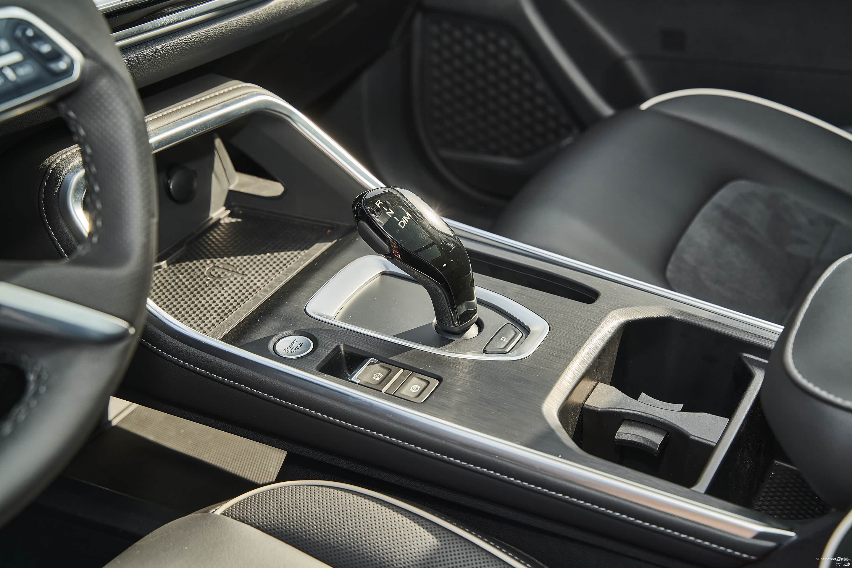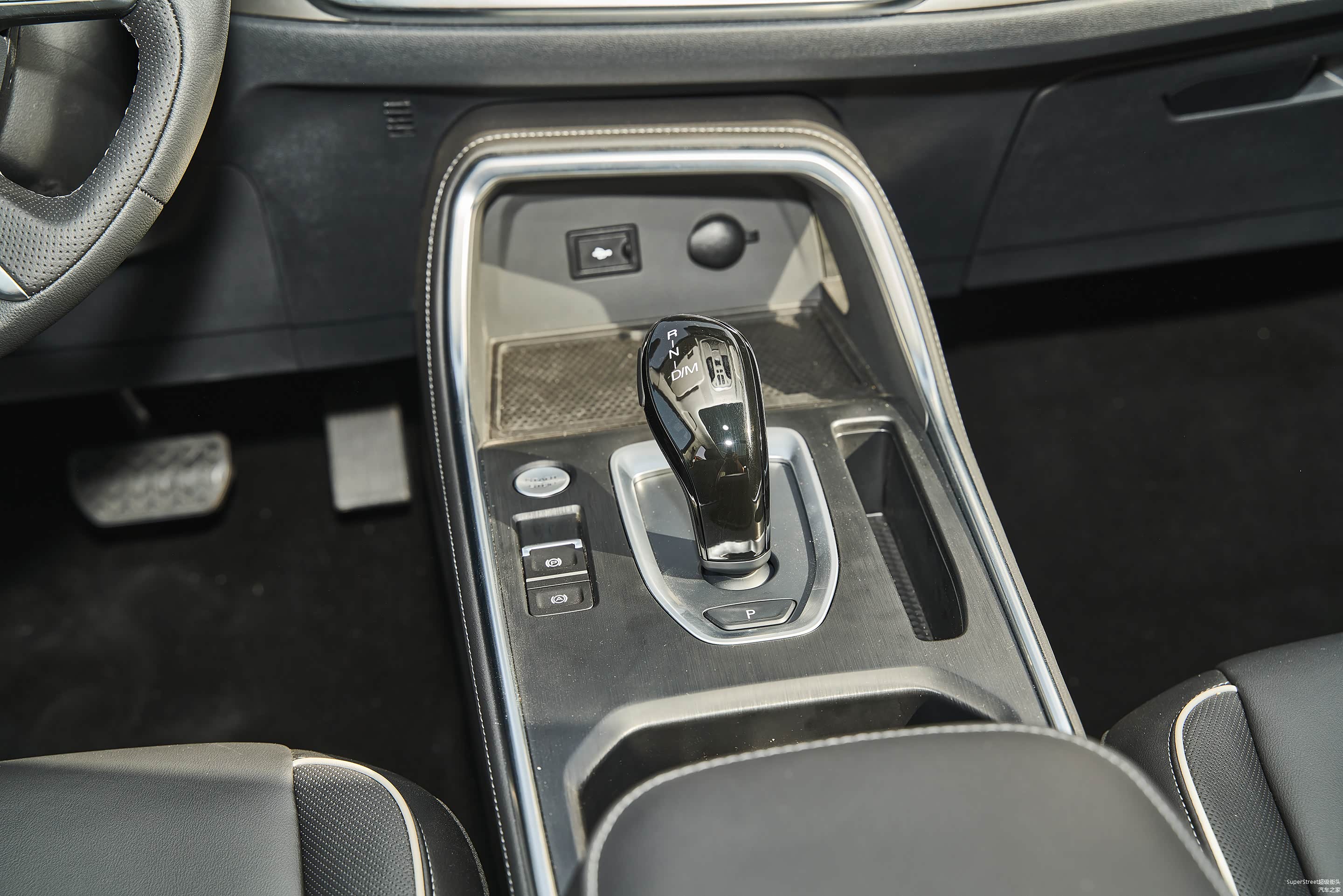 一键启动的按钮布置在中控区域的档把左侧,下面还有电子手刹和自动驻车功能。中控区域有两个杯架,一个横条储物格,可以放置一些卡片和零钱,前面还配有无线充电板。