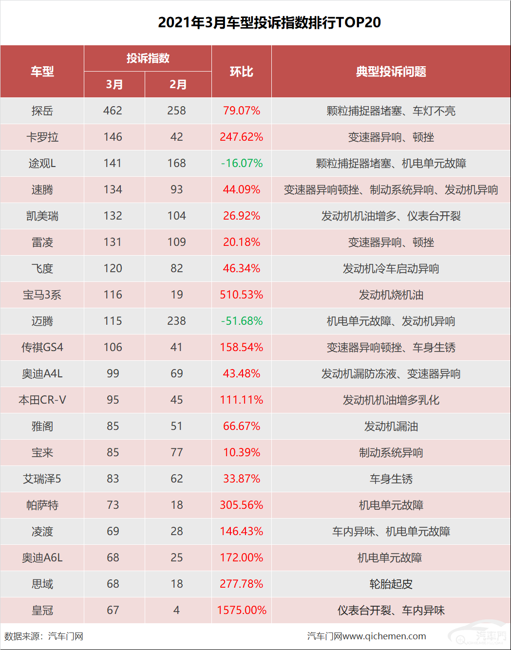 2021年三月份,伴随着车辆使用率的提升,整体投诉指数环比大幅上涨,TOP20车型中,前三名中有两款大众车型一款丰田车型,探岳“车灯不亮,颗粒捕捉器堵塞”问题突出;卡罗拉变速箱异响顿挫问题集中爆发;途观L“变速箱机电单元故障问题”频发,且多数出现在出保前后。